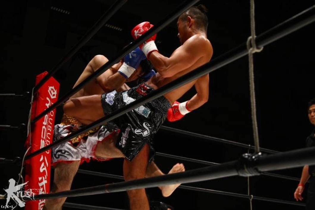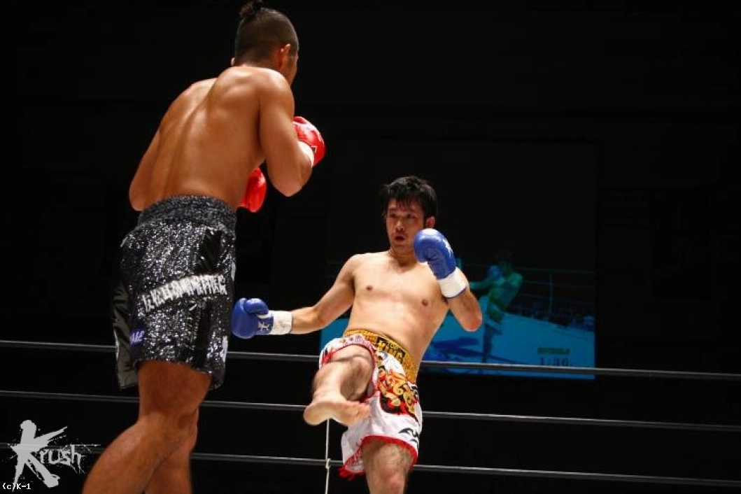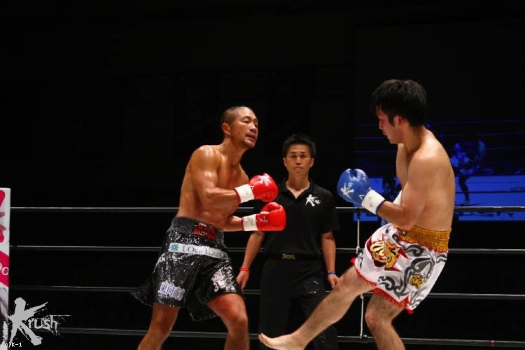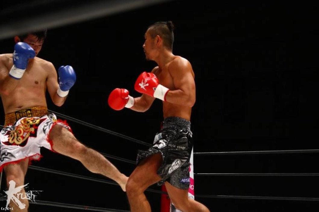 2R、中村はやはり前蹴りで距離を調整しながら、右ストレート、左フック、右フックと重みのあるパンチを打ち込む。これに対しHIROYUKIは中村にローを打ち込み、やはりパンチの合間にフックを返す。そしてこの右フックを中村の右ヒザにタイミングよく決め、中村からダウンを奪う。苦笑いを浮かべる中村。