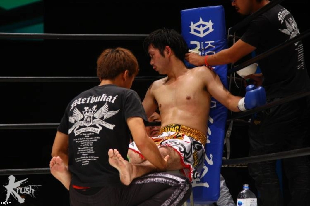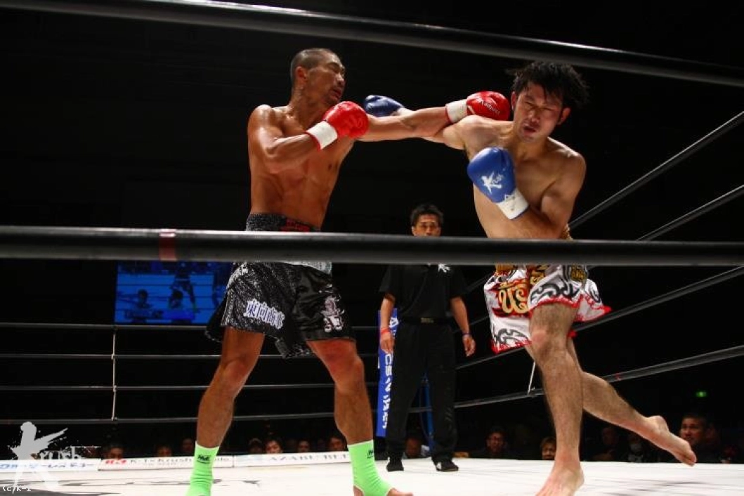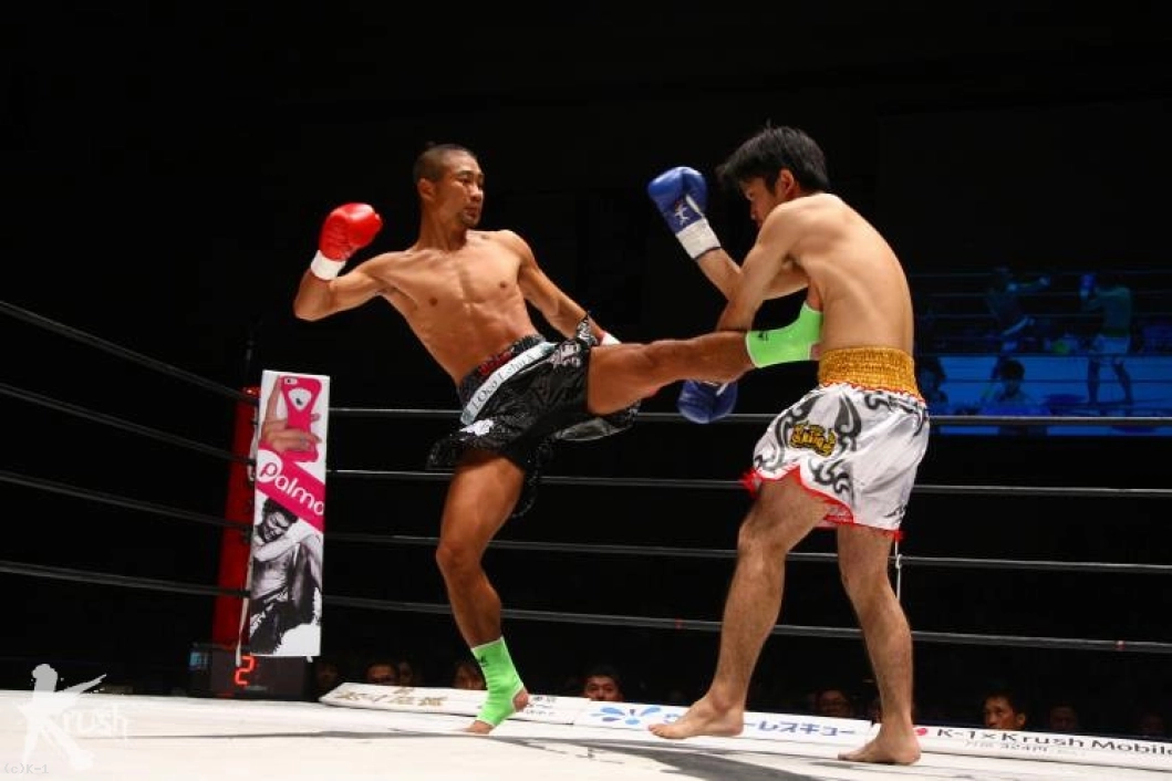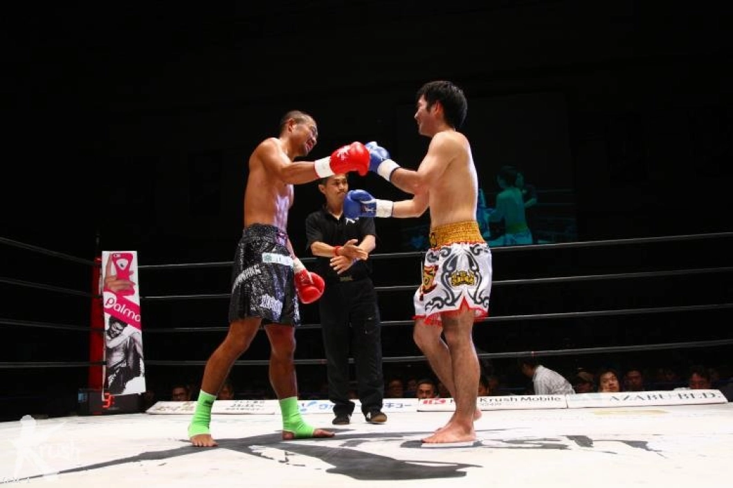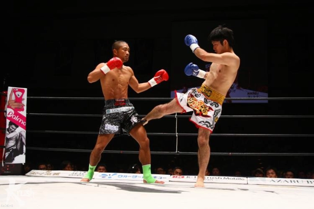 2R、中村はやはり前蹴りで距離を調整しながら、右ストレート、左フック、右フックと重みのあるパンチを打ち込む。これに対しHIROYUKIは中村にローを打ち込み、やはりパンチの合間にフックを返す。そしてこの右フックを中村の右ヒザにタイミングよく決め、中村からダウンを奪う。苦笑いを浮かべる中村。
