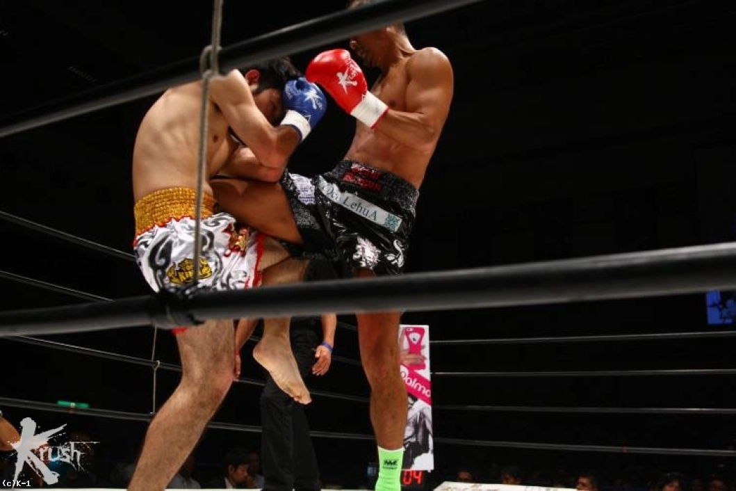 3R、ダウンを奪われている中村はその分の挽回に前へ出る。HIROYUKIはガードを緩めず中村の足にローを集める。中村は顔への左右ストレート、ボディへのヒザと放っていくのだが、HIROYUKIはほころびを見せない。派手さはないが、中村の攻撃を受けると着実にローを返すHIROYUKI。