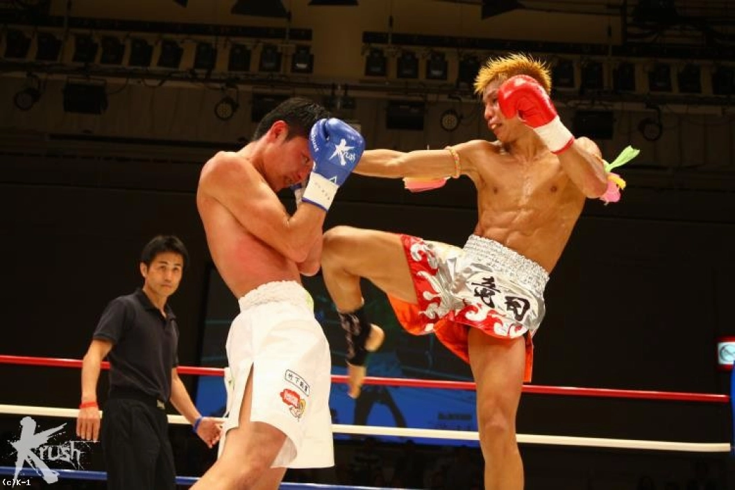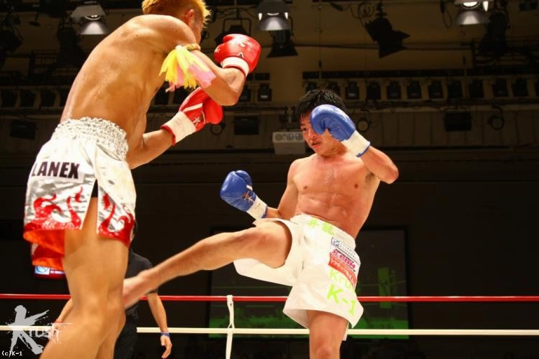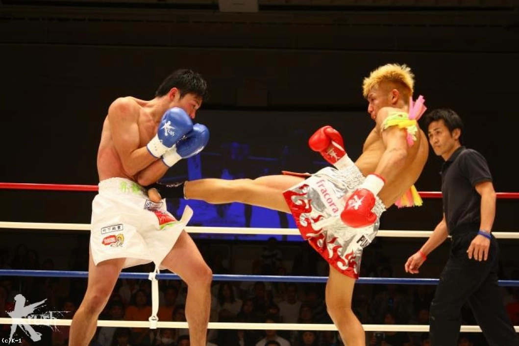 3R、石田は打ち合いの中で突き上げたヒザで堀尾のアゴをとらえる。このラウンドも左ミドルを堀尾のわき腹に好打し、続いてのボディフックでも堀尾を削る。堀尾も小刻みな左右のパンチ、前蹴りと応戦するのだが、石田は顔を紅潮させながらも下がらず、左ボディ、左ミドルと堀尾に押し勝って下がらせる。
