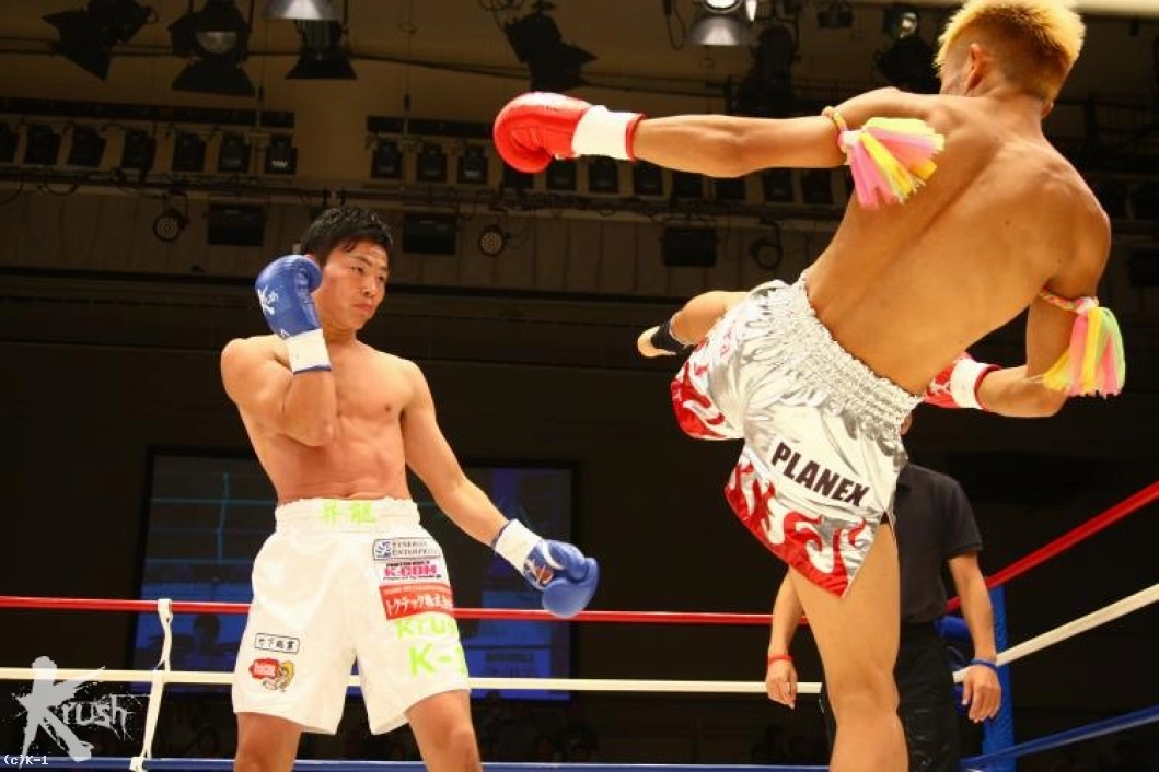2R、ミドル、ストレートとボディ攻めが巧みで石田は堀尾を前に出させない。ボディフック、ボディへのヒザとさらに攻め、堀尾もボディフック、跳び上がってのヒザと反撃するのだが、石田が圧力で上回って堀尾を下がらせる。石田は左ミドルで堀尾のわき腹をエグり、そこからグッと押して出る。だが、堀尾も顔面前蹴り、バックブロー、右ストレートに右ハイと後半加速して、印象を取り戻して2Rを終了する。