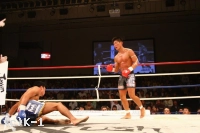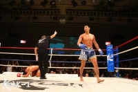 2R、このラウンドも前に出てくる渡部に塚越は前蹴りを打ち込んで抑え、左右のステップワークで圧力を正面で受けないようにする。やや前進を止められる渡部。そこへ右ストレートを当て、塚越は左フック、前蹴りと猛ラッシュ。渡部はダメージを感じさせガードが落ちる。塚越は警戒しながらも右ストレート、左フック、右ヒザから返しの左フックをクリーンヒット。そして跳びヒザからの左フックで遂に渡部を前のめりにダウンさせる。