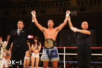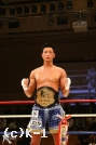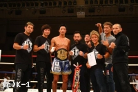 「初挑戦でベルトを獲得した感想は?)不思議な感じですね、夢を見ているようです。(試合は壮絶だったが?)お客さんの声しか聞こえなくて、あとは何も覚えてないです。断片的に攻められているところが出てくるんですけど、勝ったんですよね?(笑)。まったく覚えてないです。まだ、全然実感がないです。(今日を迎えるまで、どんな思いだった?)とにかく、悪夢にうなされ続けました(苦笑)。魔裟斗さんに『初めてのタイトルは緊張するぞ』って言われてから、悪夢を見てました(苦笑)。でも、67に転向してからはやり続けたことが変わらないので、それが出たのかなって思います。(デビュー10年目で巻くのも珍しいというか)余計、縁が浅いものと思っていたので、でも、獲ったからにはチャンピオンとしてやっていきたいです。リングで巻いたときもフワッとしてましたし、いまだに夢見ているような気がします。(選手の相性は感じる?)そうですね。渡部選手は気持ちの強い選手なので、最後まで気を抜けないし、渡部選手だからこういう試合になったのかなって思います。前回負けて、今回勝った感じなので、このままじゃ終わらないんじゃないかなって。あんまり考えたくないですけど(苦笑)。