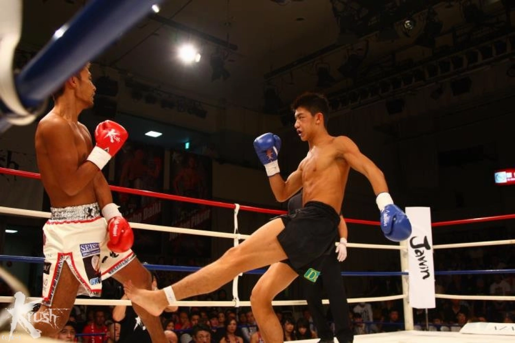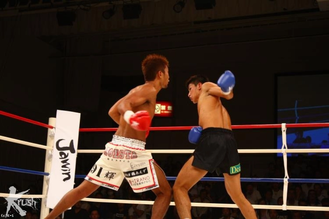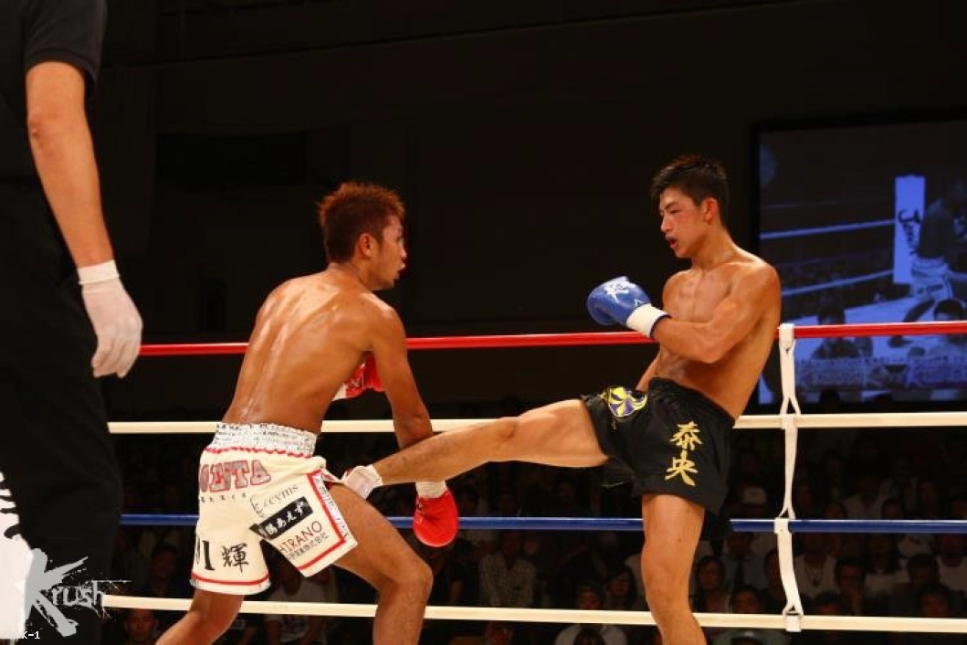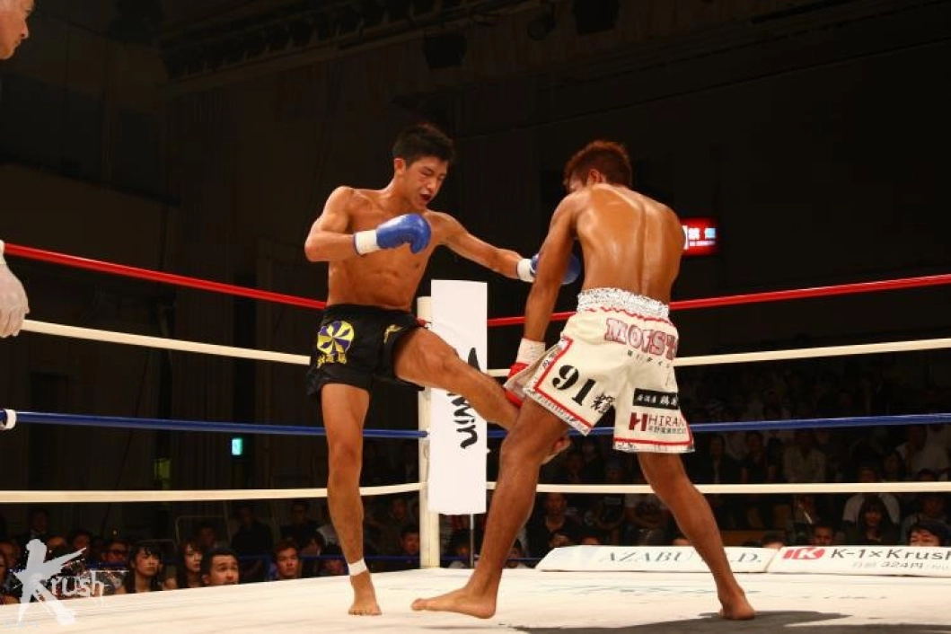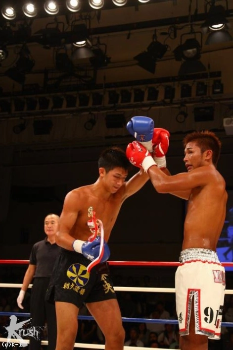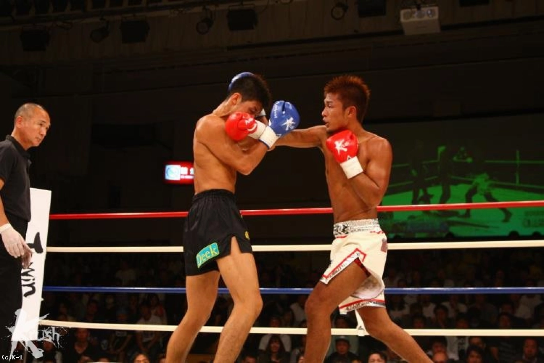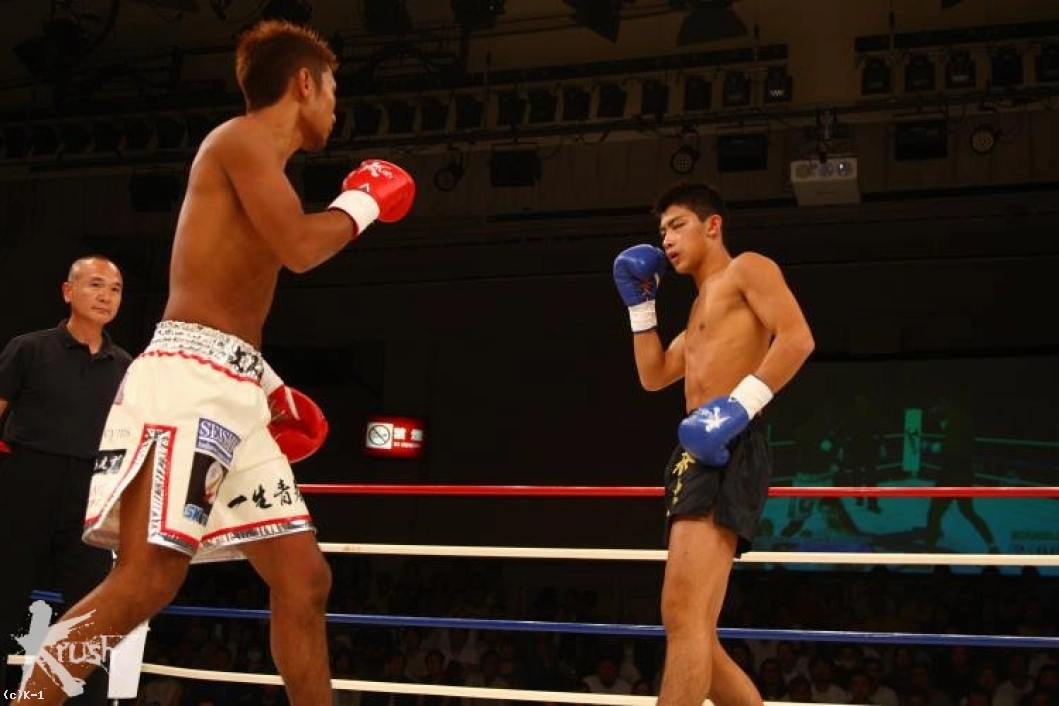2R、大沢は前に出てプッシングを交えながら朝久を下がらせ、左右のフックでとらえんとする。だが、朝久もパンチを予期してブロッキングでこれを弾く。そして左ミドル、顔面前蹴りと大沢をとらえる。大沢は1Rと異なり下がらず前に出てプレッシャーを掛けていく。だが朝久は左インローでダメージを与えて大沢を下がらせる。