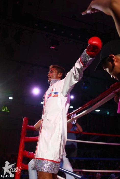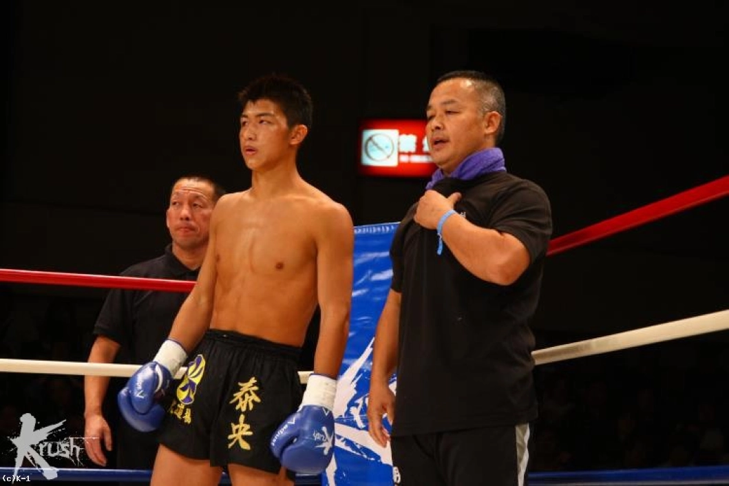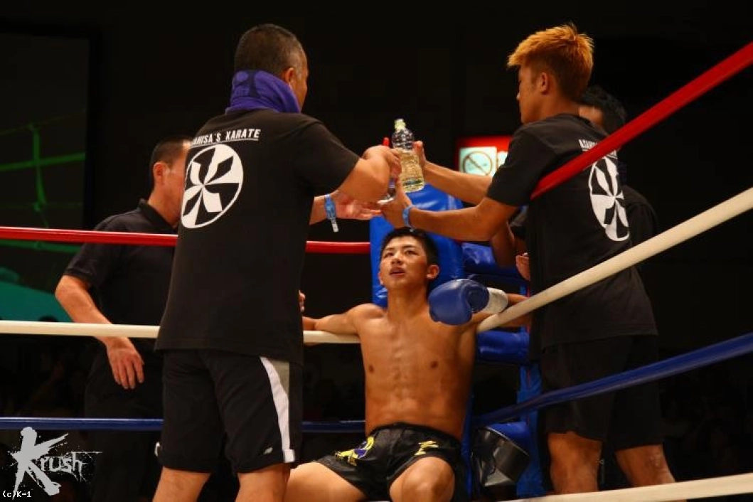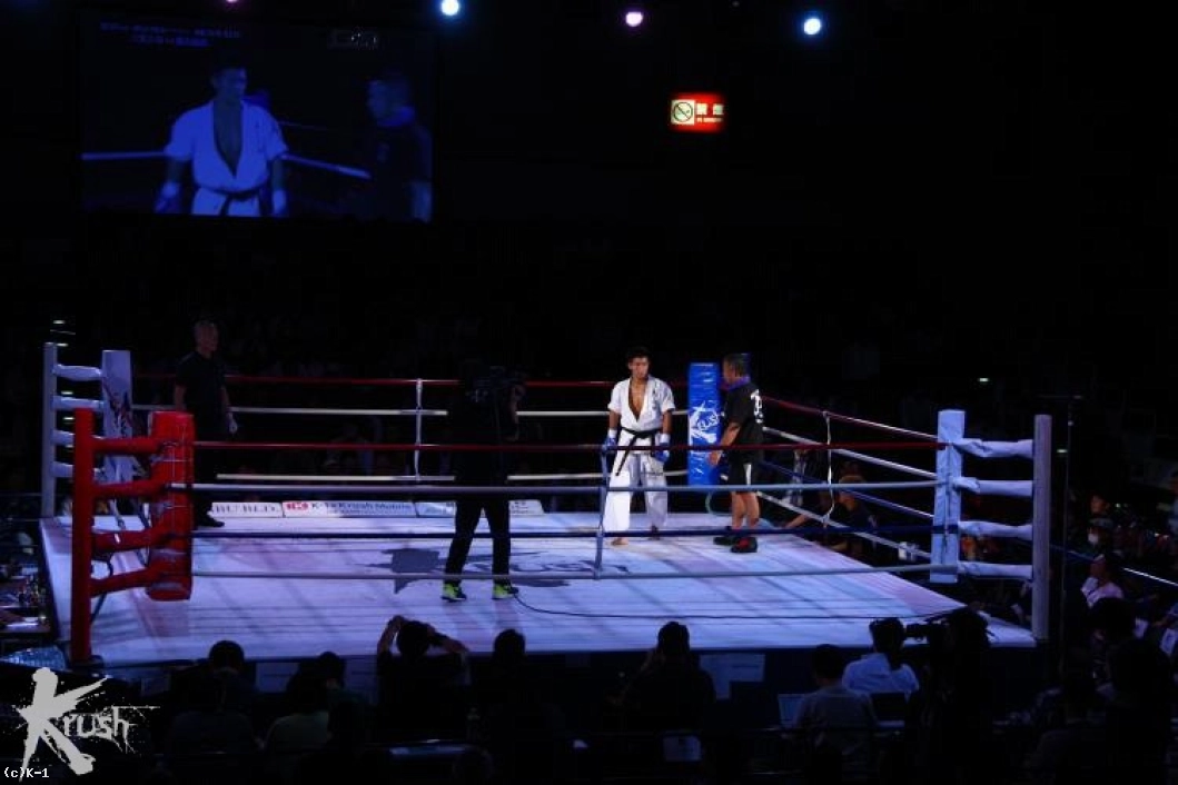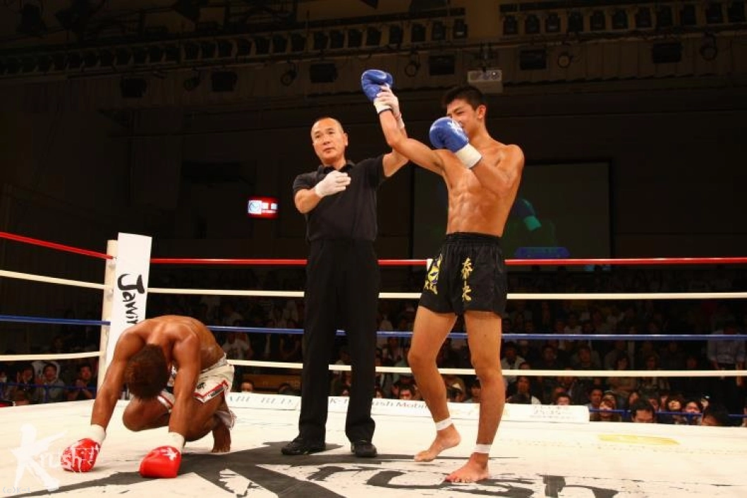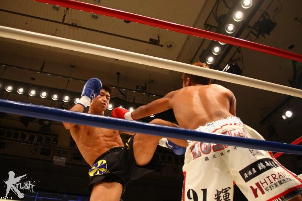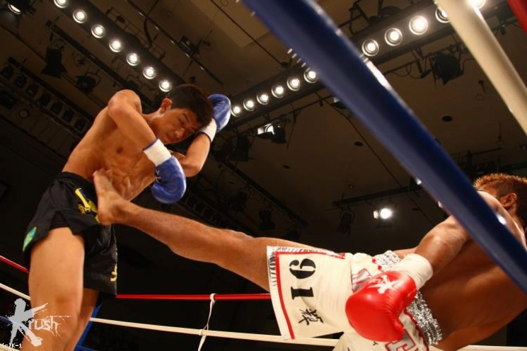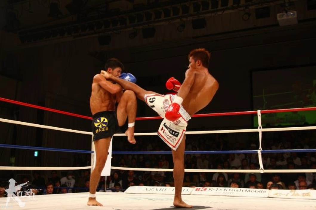 2R、大沢は前に出てプッシングを交えながら朝久を下がらせ、左右のフックでとらえんとする。だが、朝久もパンチを予期してブロッキングでこれを弾く。そして左ミドル、顔面前蹴りと大沢をとらえる。大沢は1Rと異なり下がらず前に出てプレッシャーを掛けていく。だが朝久は左インローでダメージを与えて大沢を下がらせる。