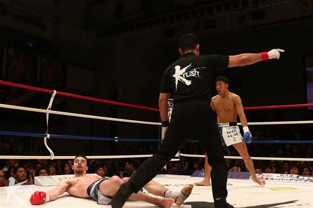 1R、西川はサウスポーから左ミドル、左ローと放って先制するが、木村も右ミドルを返す。重みある蹴りを響かせる木村。そして西川が飛び込んでくると、右フックを合わせ、これに西川は転倒。西川は「ノーダメージ」をアピールするが、レフェリーはダウンを宣告する。