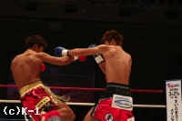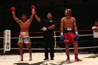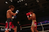 場内のコールを受け、中澤をコーナーから逃がさない左右田。中澤は左右フックをよいタイミングで当てるが、左右田は下がらない。さらに右フックでフラつかせるが、左右田はすぐに体勢を立て直し、なおコーナー際から逃さず、中澤に右フックとボディへのヒザを打ち込む。判定は10-9(左右田)、10-9(左右田)、10-9(中澤)の2-1で中澤。大接戦を制し初防衛を成し遂げた。