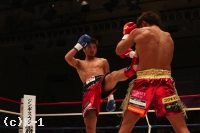 2R、左右田は左インロー、左ミドル。中澤はしかし踏み込みからの左ショートフックを当て返す。そして1Rに続いて右ローでも左右田をとらえる。中澤が左右のフックで迫ると、左右田はボディへのヒザから右ストレート、左ストレートと応戦する。