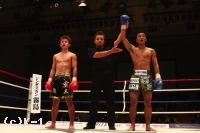 判定は30-27、30-28、30-27の3-0で林。距離を潰しての強打と連打で石塚に蹴りを発揮させず勝利した。