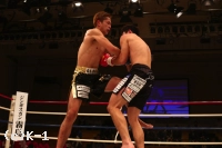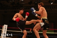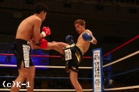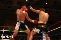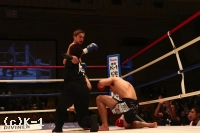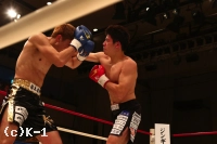 立ち上がった佐野に鈴木はヒザ、跳び蹴りとさらに攻勢。鈴木はボディ打ちも織り交ぜる。佐野はジャブ・左フックを伸ばすが鈴木の勢いは落ちない。ローを繰り出し鈴木を止めんとする佐野。