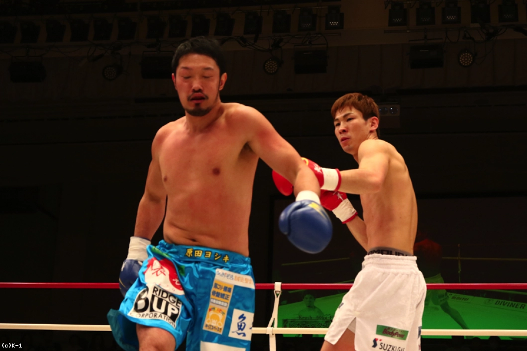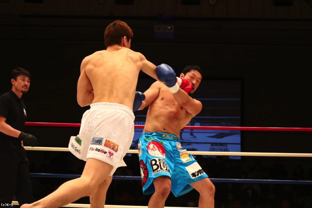 1R、原田はサウスポーに構えてフットワークでリングを回る。そしてローを入れていくが、レオナはこれに対し右ミドル、三日月蹴りを打ち込む。そこから右ストレート、左フックを繋ぐが、原田もそのタイミングで右フックを振るって狙う。原田はステップインするとジャンプしながらパンチを見舞うが、レオナはこれを右ストレートで迎撃。