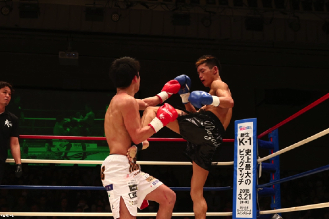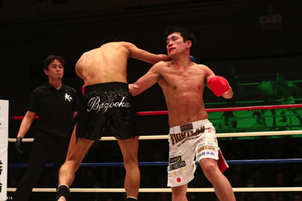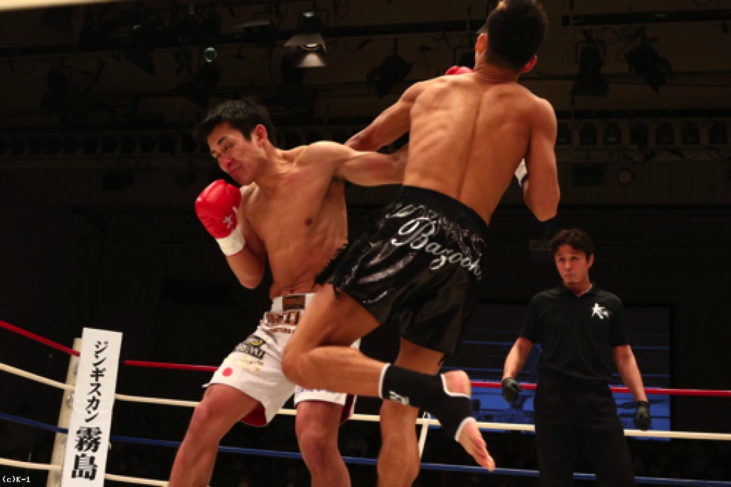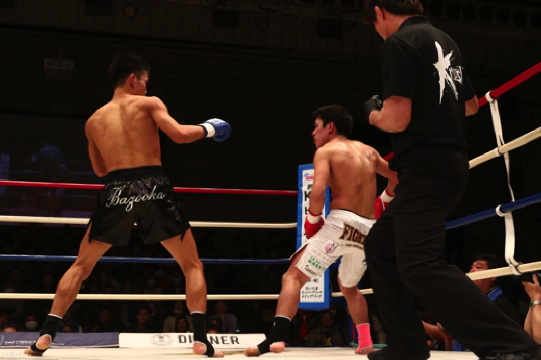 2R、バズーカは再びサウスポーから左ミドル。稲石はそこへ左右のフックを上下に打ち分けて迫る。バズーカは飛び込んでくる稲石にカウンターのストレート、フックを狙う。そして鋭い右ハイキックを放って当てると稲石はこれにフラつき、バズーカは左フックで追撃。しかし稲石は足がしっかりしてくるとミドルで反撃する。だがバズーカはバックブローも見舞って好印象でラウンドを終える。