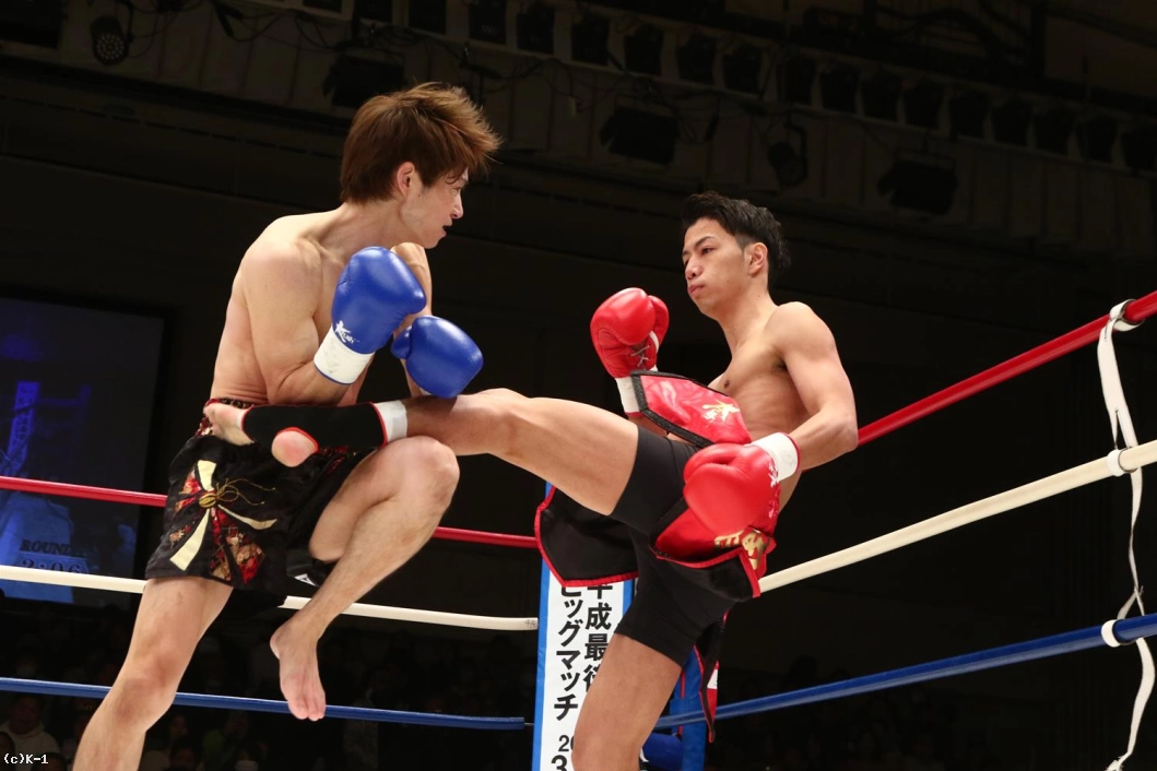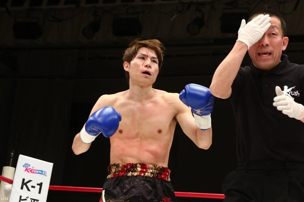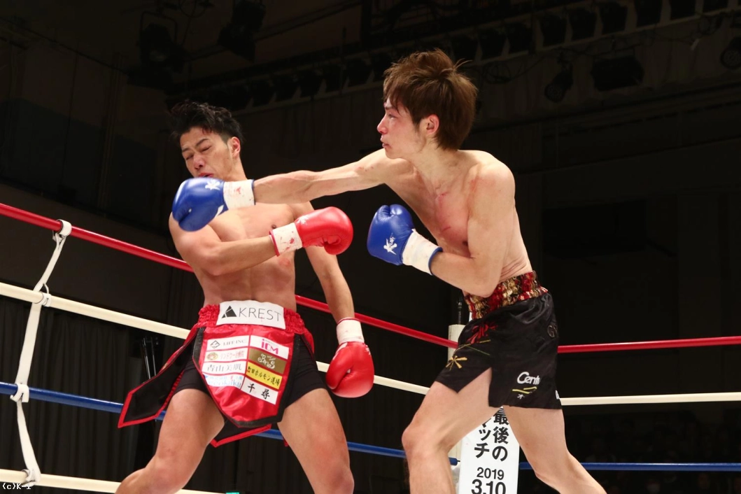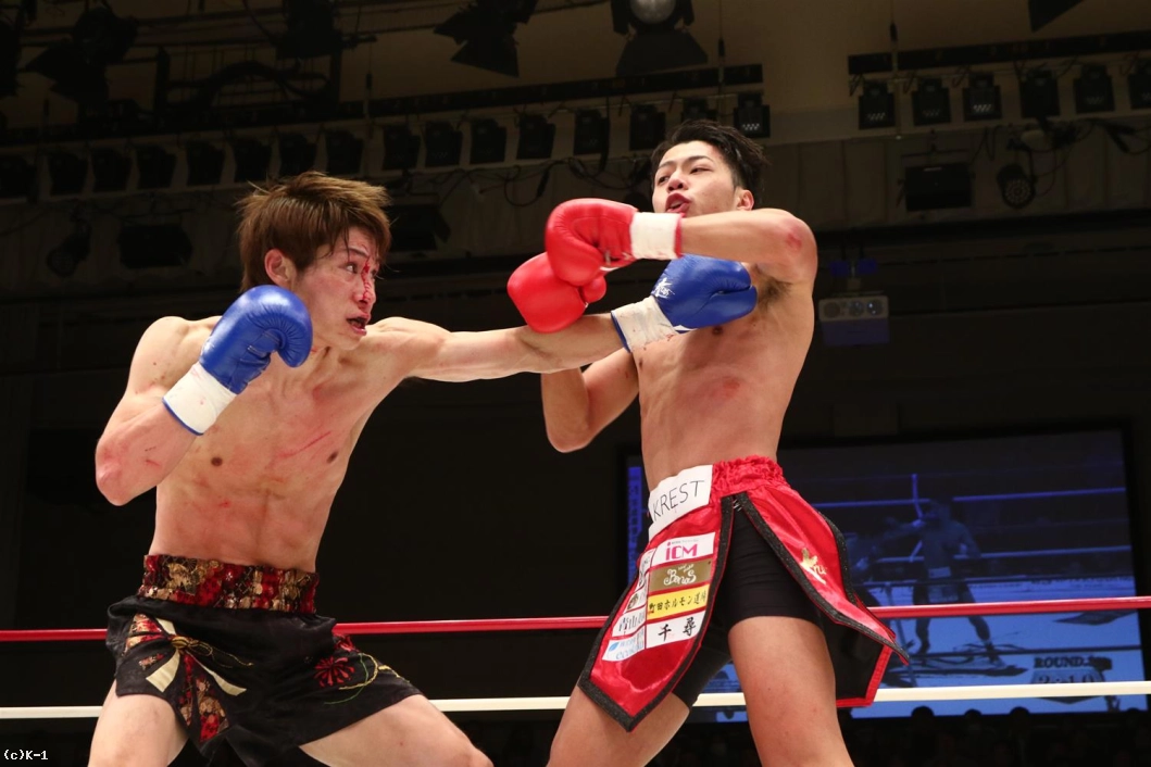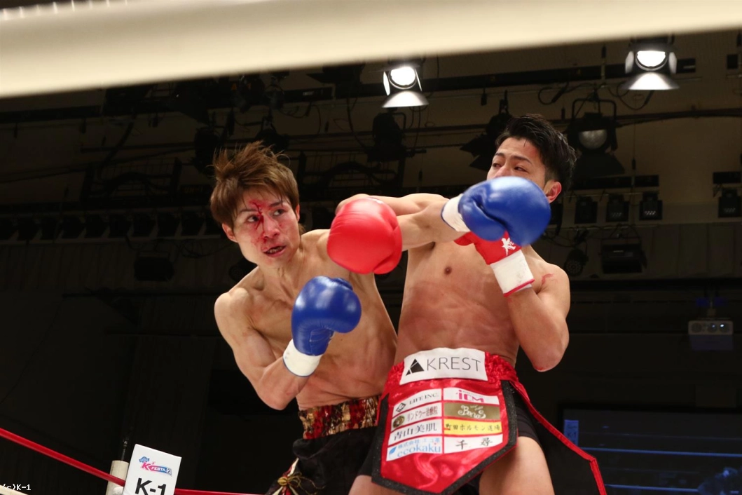 2R、このラウンドも前に出る姿勢が目につく出貝。亀本は右ロー・左ミドルで出貝の突進をけん制する。これに対し出貝は右のパンチをストレート、ロングフックと使い分け、ヒット数を上げる。亀本も左ミドルから左ロングフックを見舞ってヒット。出貝は額の傷だけでなく鼻血も見られる。亀本は右に回って出貝の突進をさばき、自身の左フック、左ストレートを当てていく。