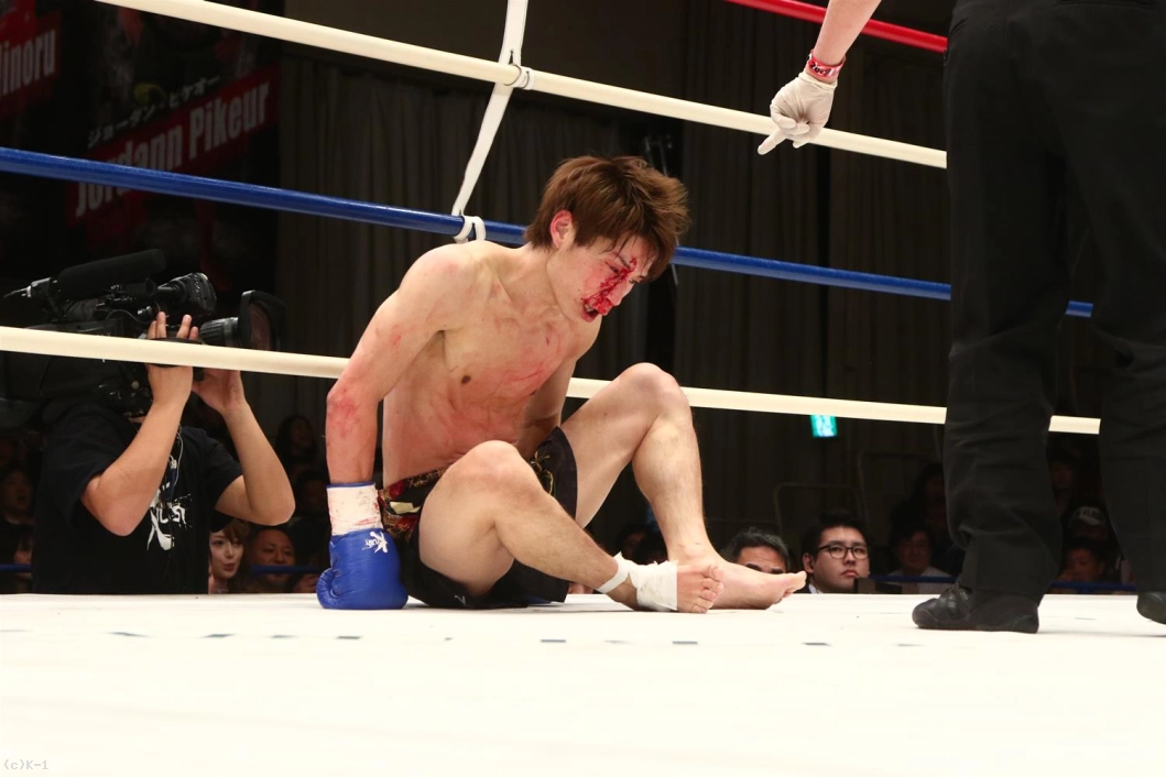 3R、出貝は前に出て亀本にロープを背負わせる。そして亀本の左ミドルを警戒しながら右ストレートを浴びせていく。亀本は接近戦で出貝をプッシュし、左ミドルをボディに蹴ると左ストレートもヒットさせる。それでも出貝は前に出るが、そこへ亀本が左ハイキックをタイミングよくヒット。これでダウンを奪い試合を終える。判定は30-27、30-27、29-27の3-0で亀本。しかしKO勝利を上げたかったか悔しそうな表情を見せた。