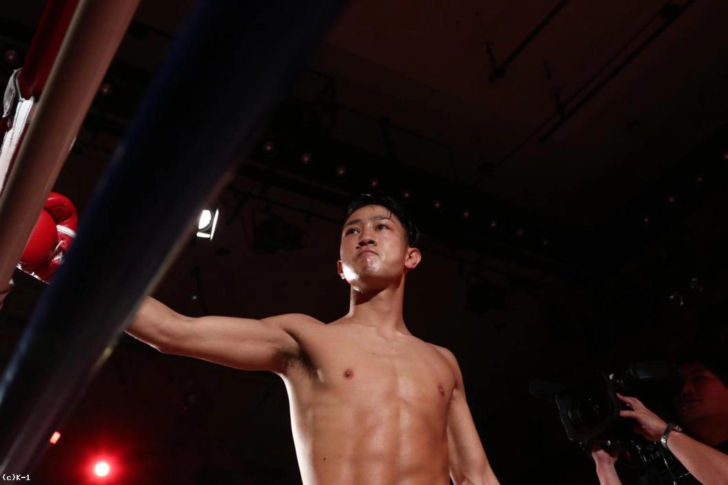 「すいません、少しマイクの時間頂きます。いつも応援ありがとうございます。今日はKO勝利を見せられてよかったです。トップ目指してチャンピオン目指して頑張っていくので、チーム全体の応援をお願いします」