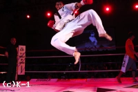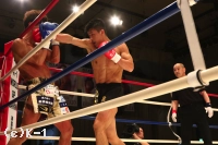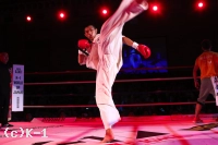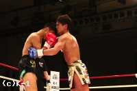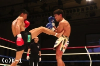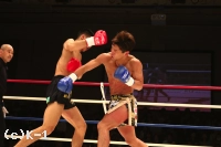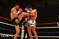 2R、朝久はカカト落としを繰り出し、足払いで山本を転倒させる。山本の太ももにヒザ蹴りも入れ、多彩な攻め手の朝久。山本も左ローを入れ朝久を嫌がらせるが、朝久はすぐに右ロー、高い前蹴りと攻撃を返し、ここもやはり朝久のリズムで試合を運ぶ。内ももを狙ったヒザを放つ朝久だが、これが山本の下腹部に誤爆してしまい、山本にダメージ回復のインターバルが与えられる。