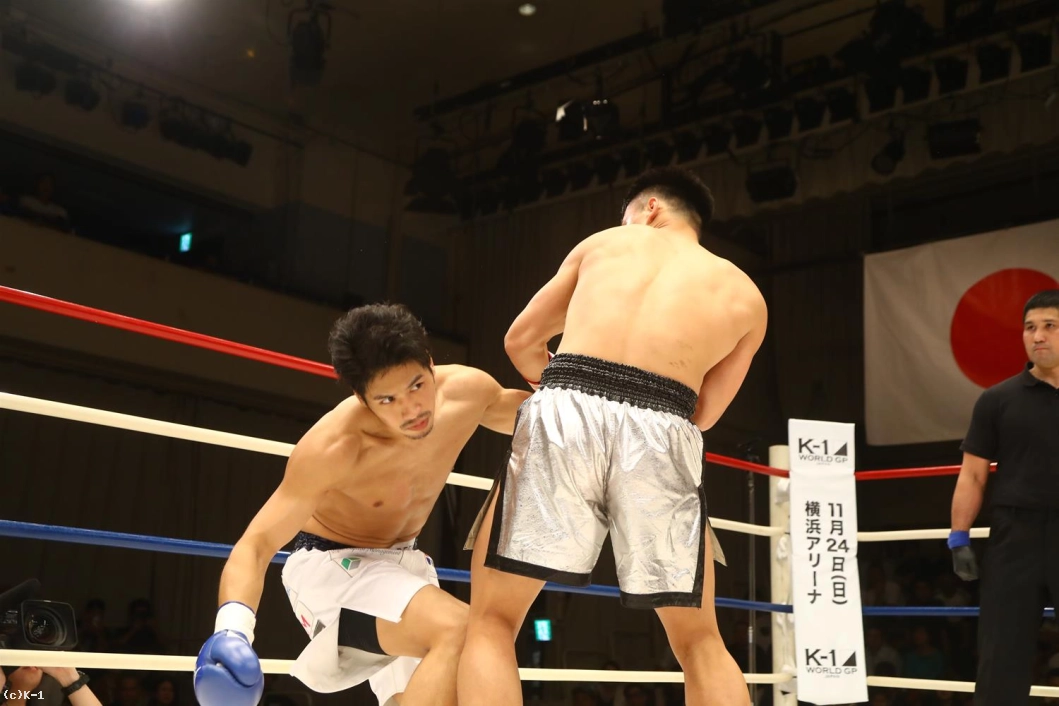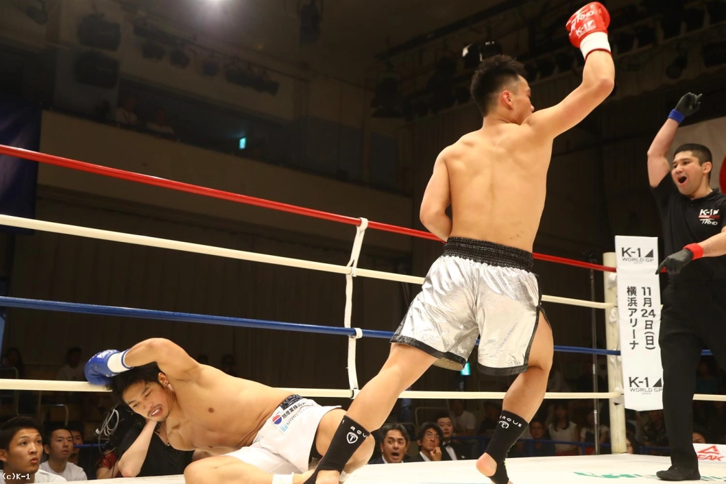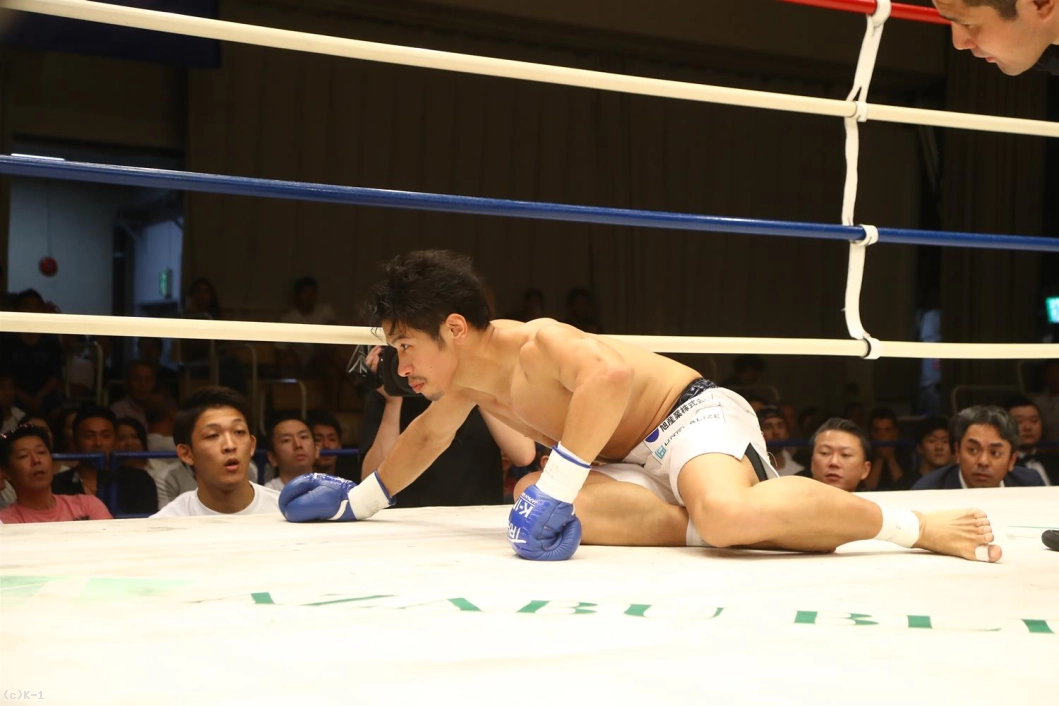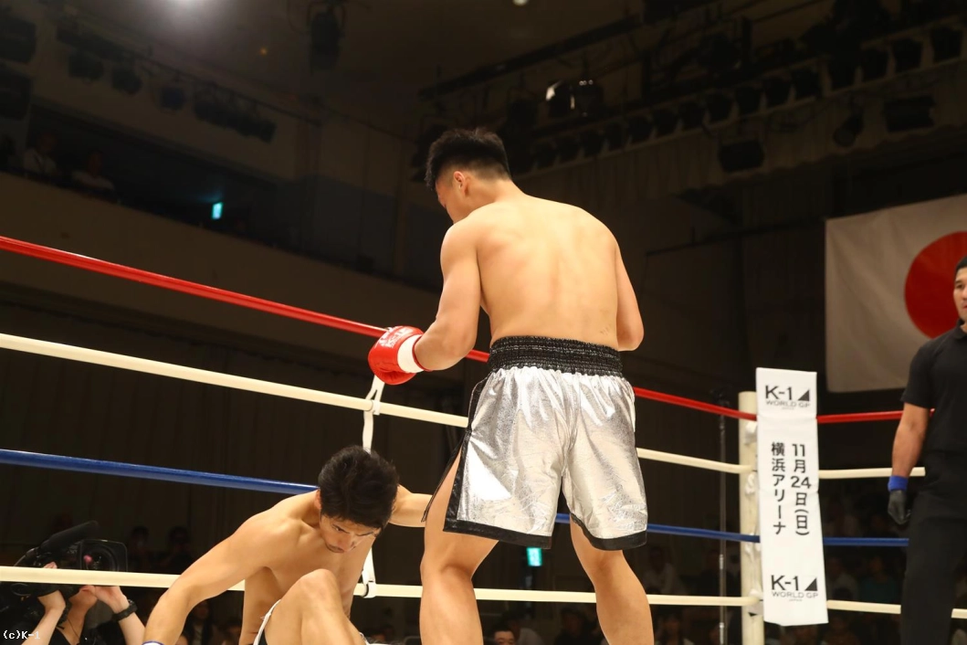 1R、功也は先にワンツーで切り込み、続いて蹴りを放っていく。しかしロープ際に下がり右フックを放とうとしたところでシュアイの右フックが先にヒット。立ち上がった功也だが足元と目がおぼついておらず、レフェリーが試合をストップした。
