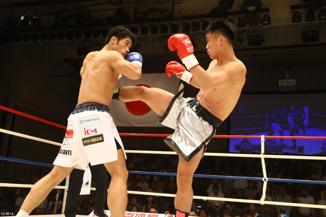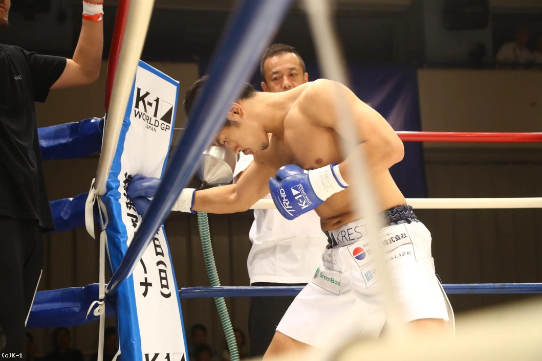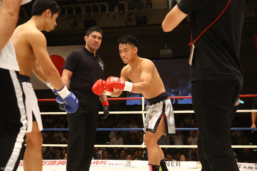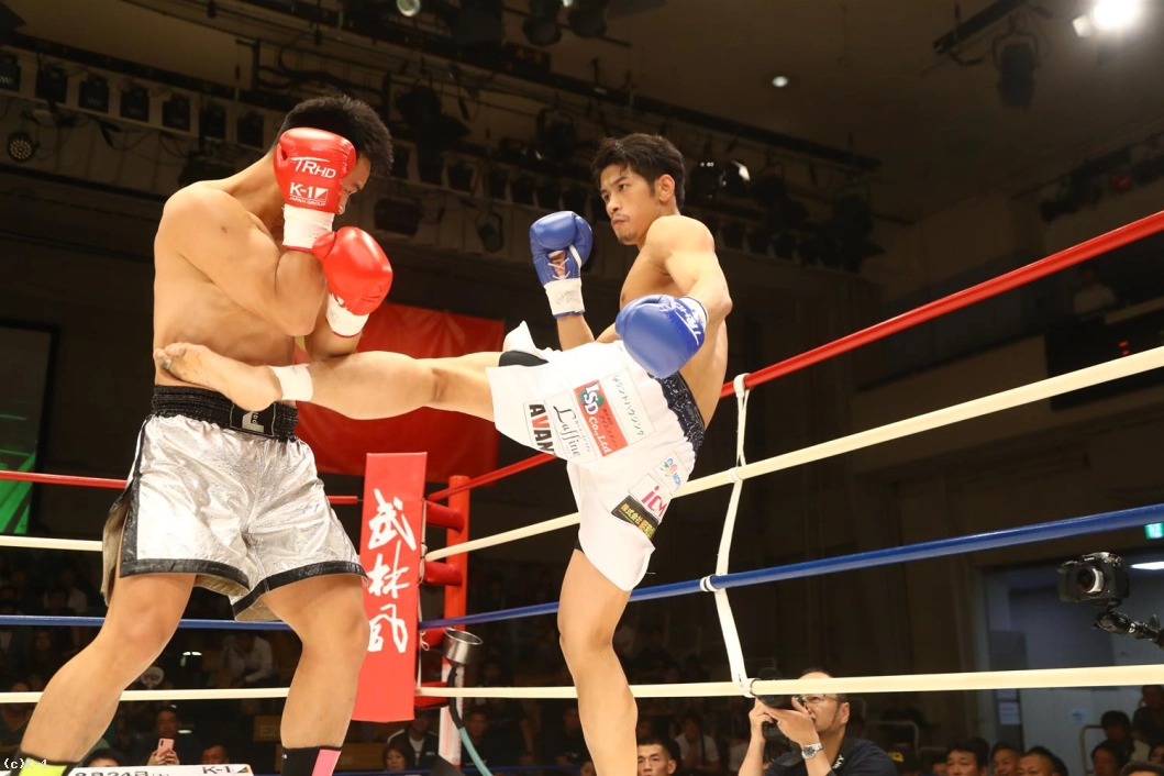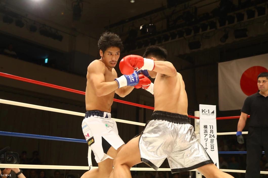 1R、功也は先にワンツーで切り込み、続いて蹴りを放っていく。しかしロープ際に下がり右フックを放とうとしたところでシュアイの右フックが先にヒット。立ち上がった功也だが足元と目がおぼついておらず、レフェリーが試合をストップした。