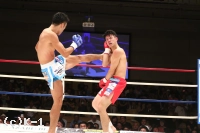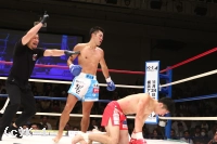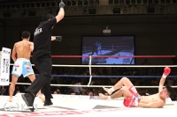 2R、中島は左ミドルで佐野をヨロめかせると、左ジャブ、右クロス、左フックとやはり攻め立てる。ダメージがうかがえる佐野だが、右ローは継続。中島はジャブ・右アッパーといったパンチから左ミドルに繋げ、これで佐野のガードを落とす。タフな佐野であったが、中島が右にステップしながら打ち下ろした右クロスに遂にダウン。立ち上がった佐野だが動きが重い。中島は左右ボディ打ちからヒザ、後ろ回し蹴りと攻めるが佐野は崩れ落ちない。