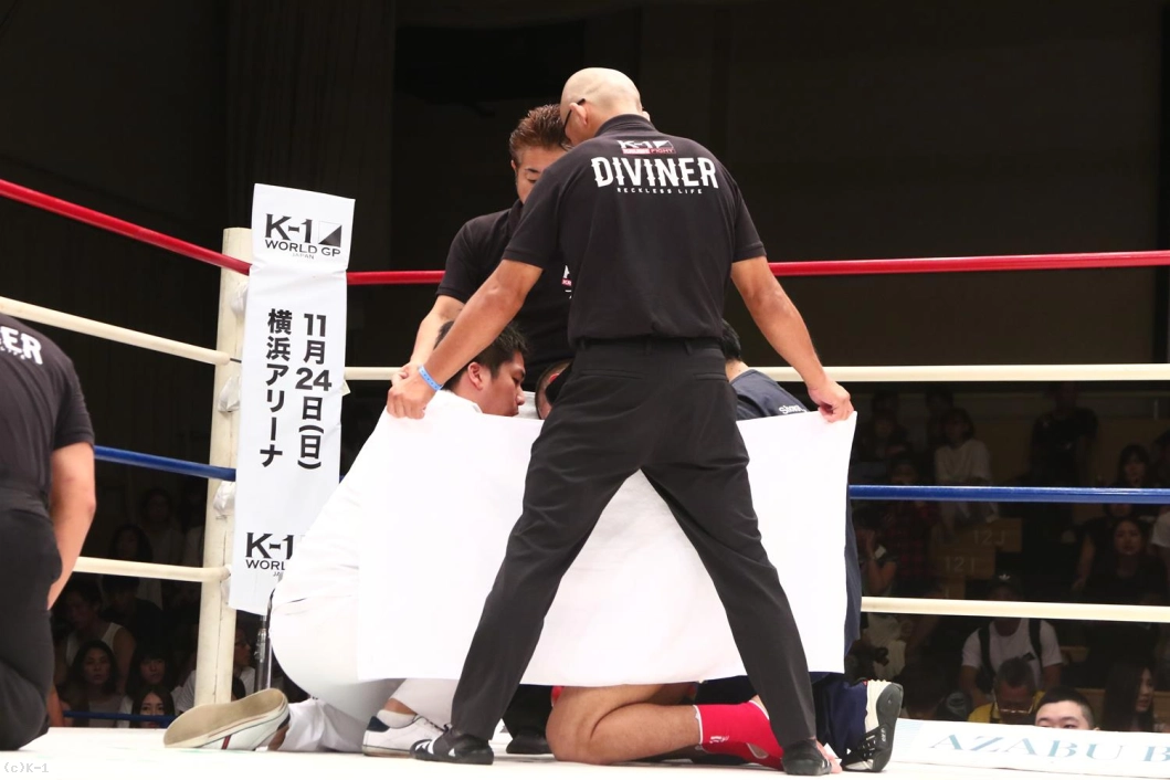 2R、優谷はダウンの影響をあまり感じさせず前に出ていくが、ここで成合が右ローを放った際にヒザが優谷の下腹部に直撃。優谷は苦悶の表情を浮かべ、なかなか立ち上がることができない。ダメージが深く、優谷はイスにも座ることができない。長く中断が続いたが優谷はダメージから回復できずレフェリーは試合をストップ。