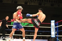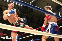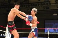 1R、両者ともオーソドックス。倉崎はベタ足で左ミドル、右ローと放ち安達に迫る。安達はジャブとミドルを放ち、倉崎の前進をけん制。倉崎は低いジャブを安達のボディに放ち、これで安達の意識を下に落とすと右フックをヒットし初回を終える。