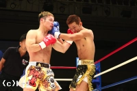 3R、前に出てくる桝本に足利は吠えるように声を発して迎え撃つ。桝本は左フック主体で、ボディと顔にこれを打ち分ける。桝本は圧力を掛け足利をロープに押し込むようにし、足利はこれによりパンチの威力が落ちる。リーチで劣る桝本だが懐に入ってパンチを回転させ、打ち合いを優位に進める。判定は29-28、30-29、30-28の3-0で桝本。持ち味である圧力と強打を活かして勝利した。