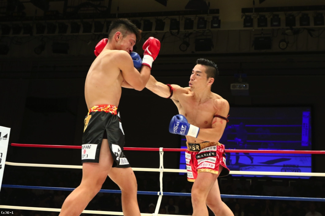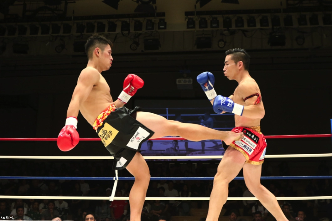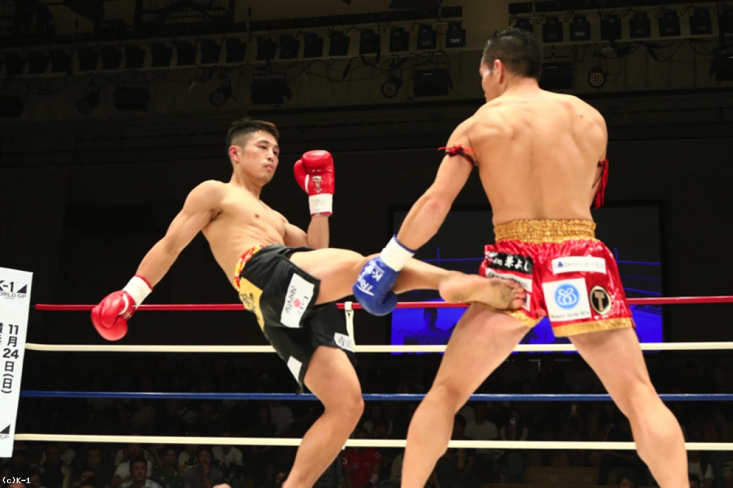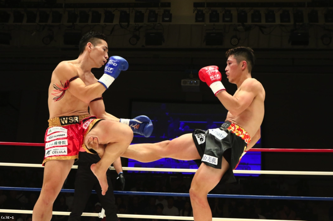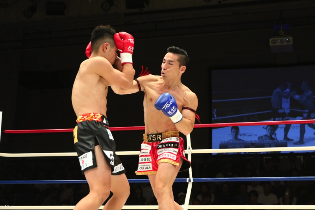 2R、聖也は1Rに増して距離を詰めてのパンチ連打。三輪はこれを押し返して右ローキック。聖也が構わず詰めてくるため、三輪は通常のローキックだけなく、足へのカカト落としも飛ばす。ガードの固い三輪に聖也はフック・アッパーと打ち分け、パンチをヒットさせんとする。三輪は右ロー主体の攻めを変えず、ジャブ・左フックから聖也の左脚を蹴っていく。