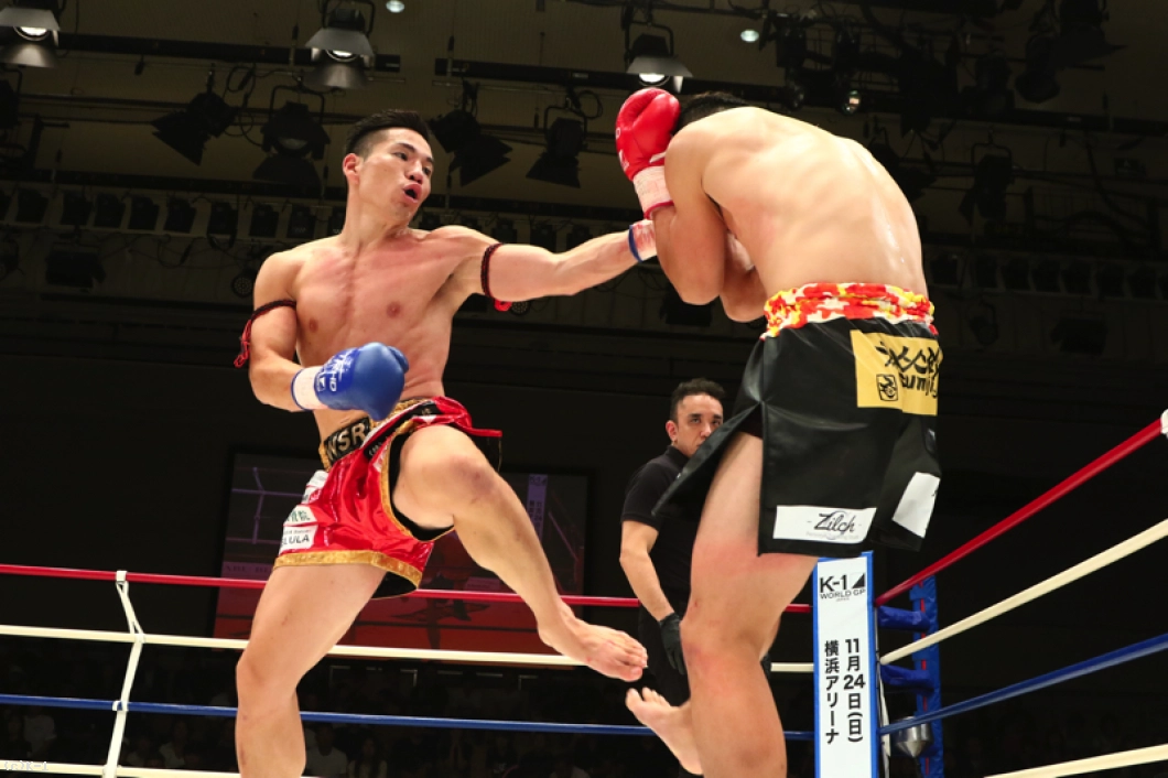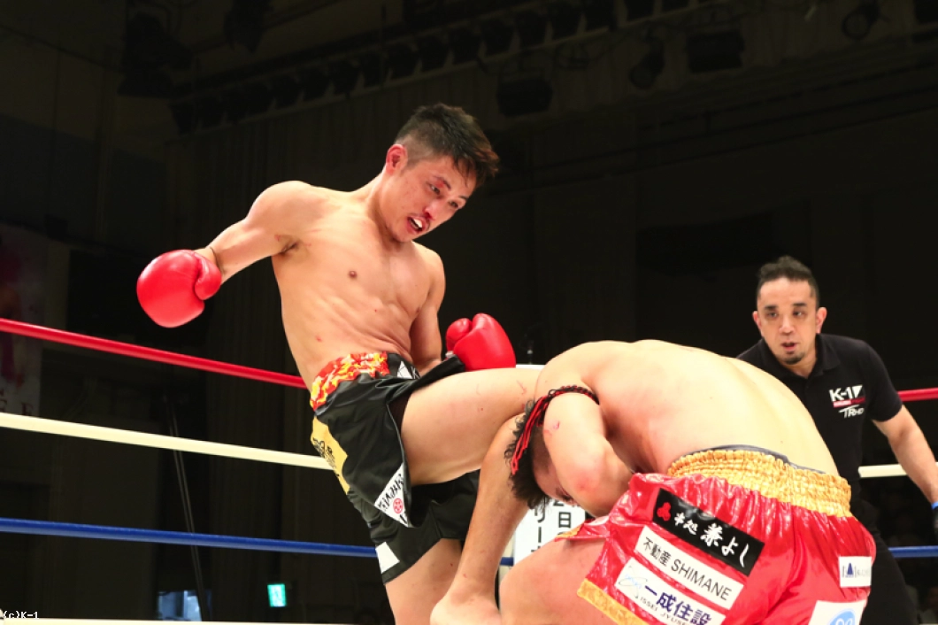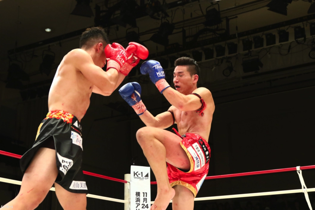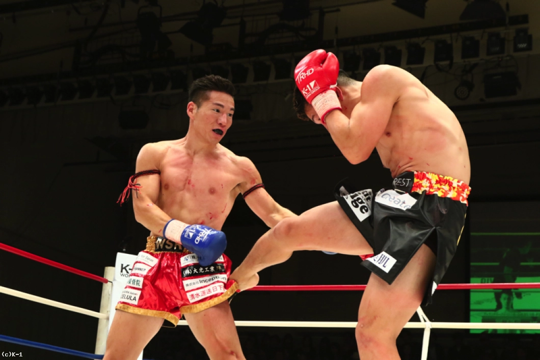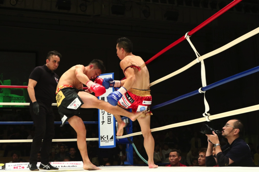 2R、聖也は1Rに増して距離を詰めてのパンチ連打。三輪はこれを押し返して右ローキック。聖也が構わず詰めてくるため、三輪は通常のローキックだけなく、足へのカカト落としも飛ばす。ガードの固い三輪に聖也はフック・アッパーと打ち分け、パンチをヒットさせんとする。三輪は右ロー主体の攻めを変えず、ジャブ・左フックから聖也の左脚を蹴っていく。