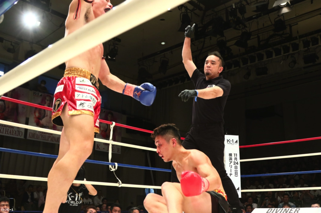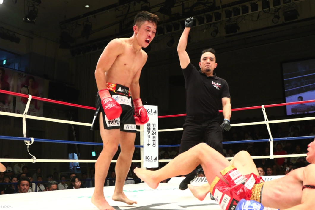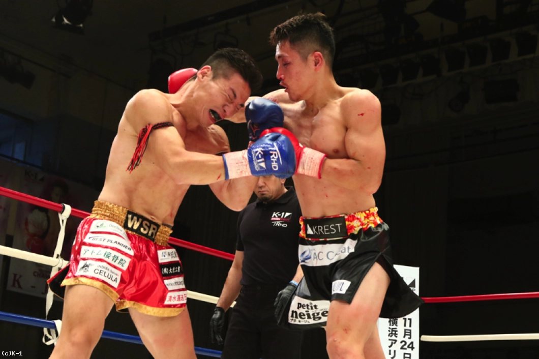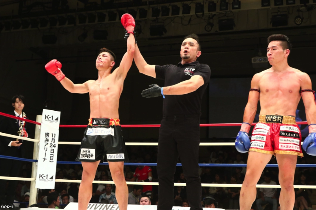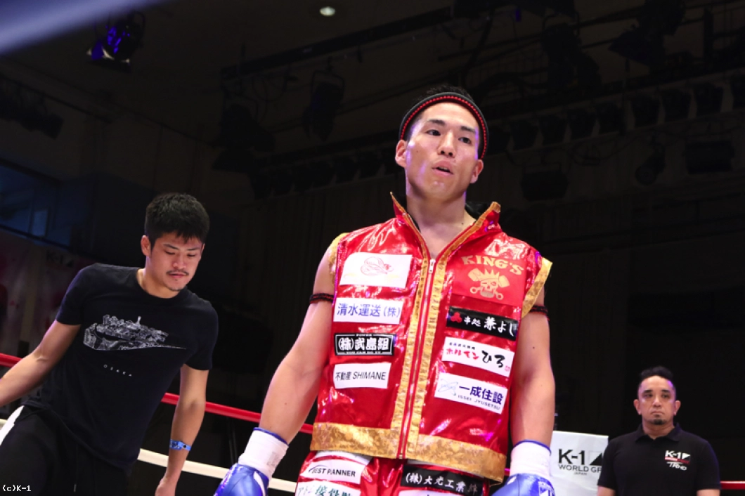 3Rも右ローの三輪とパンチの聖也の構図は変わらない。頭が当たってしまう聖也にバッティングの注意が出された後、三輪が左側へ回ろうとしたところを聖也が右ショートフックでとらえダウンを奪取。立ち上がった三輪は反撃に移り、接近戦で左ボディフックをめり込ませると聖也がダウン。土壇場でダウンを奪い返して試合を終える。判定は28-27、28-27、28-27の3-0で三輪。終盤に奪い返したダウンで勝利を掴んだ。