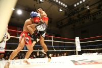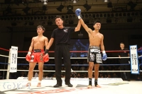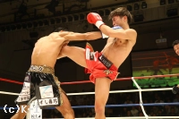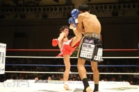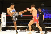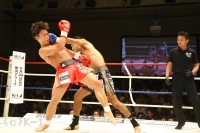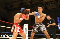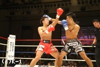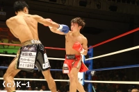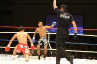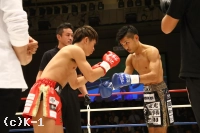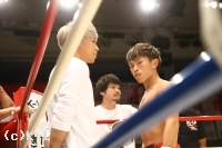 2R、佐々木はこのラウンドもステップを続けてリングを回り、右ボディフック。晃貴が入って来ようとするとやはり左クロスで進入を阻む。そして晃貴の前蹴りの直後に左ストレートを合わせ、晃貴がバランスを崩すとダウンが宣告される。晃貴はダウンの挽回に前へ出てパンチを振るうが、佐々木をとらえられない。グッとダッキングして懐に入る佐々木はその後で晃貴に組みつきパンチを封じる。