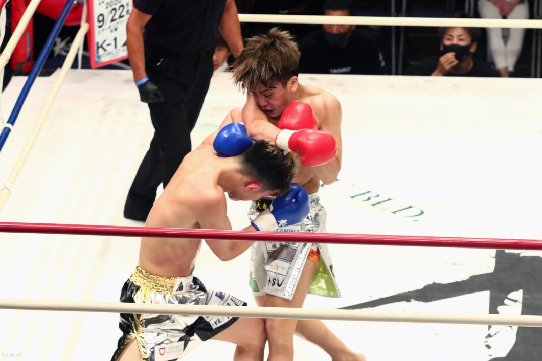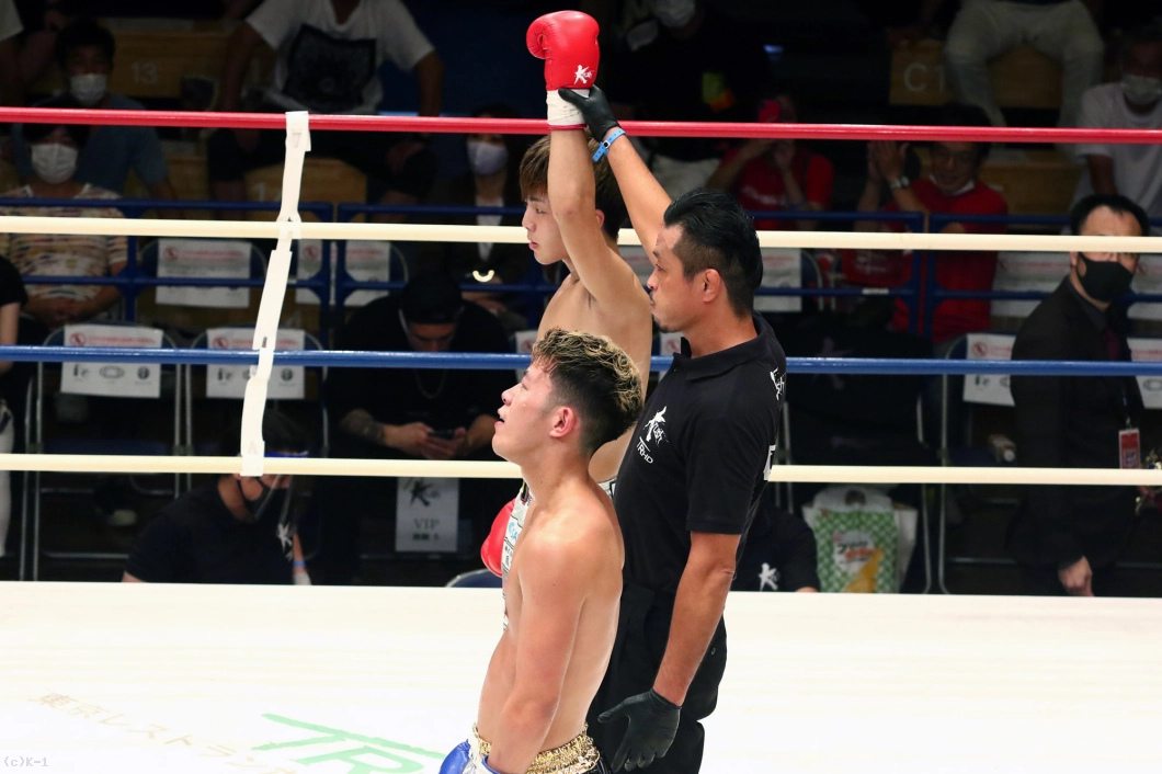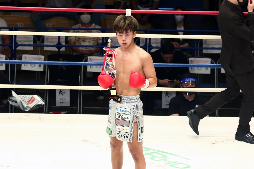 「(試合を振り返って?)今回、二連敗してて、試合がメチャクチャ怖くて。提髪選手もメチャクチャ強かったんで、メチャクチャ緊張しました。でも、階級を上げて、60kgで戦って、意外と通用するんやなっていうのを見せられたと思います。(対戦相手の印象は?)圧力があって、ちょっと怖いなっていう感じで戦いました。(今後の目標は?)今後は60kgでやっていこうと思うので、これからK-1の顔になれるような選手になっていこうと思います。これからも応援よろしくお願いします」