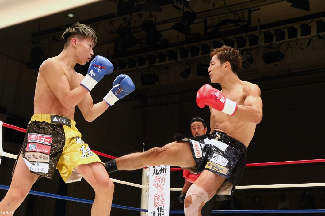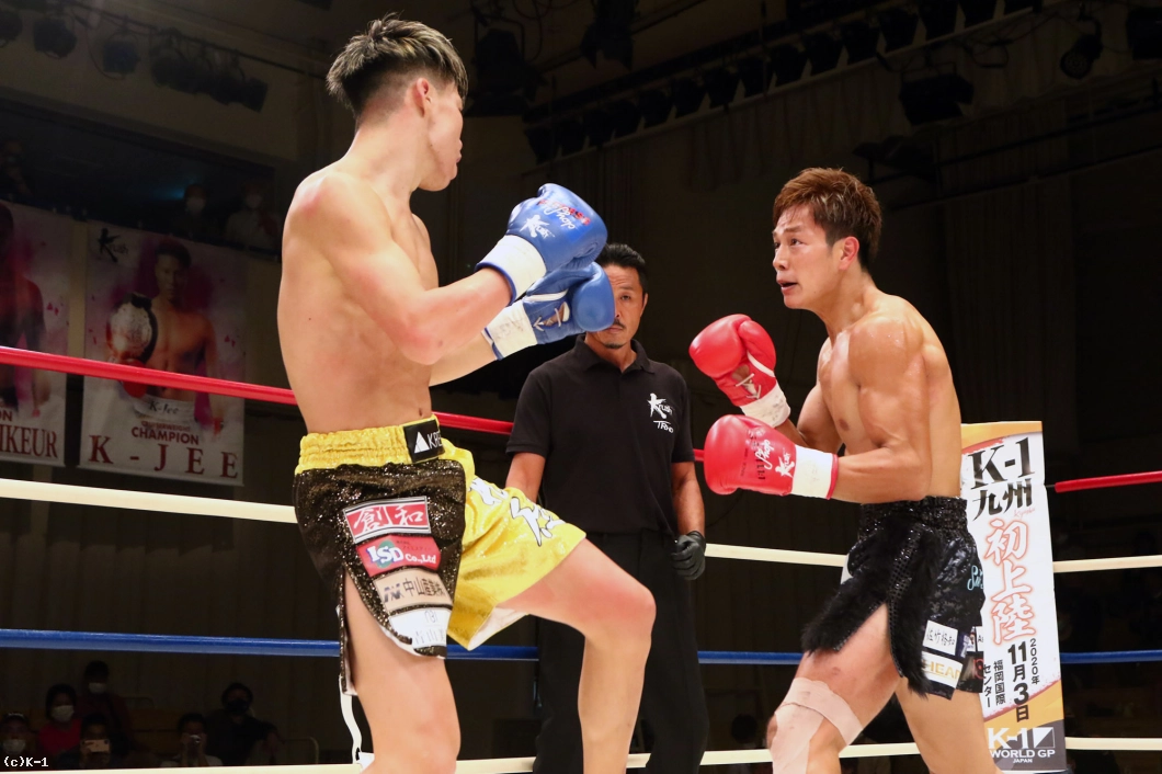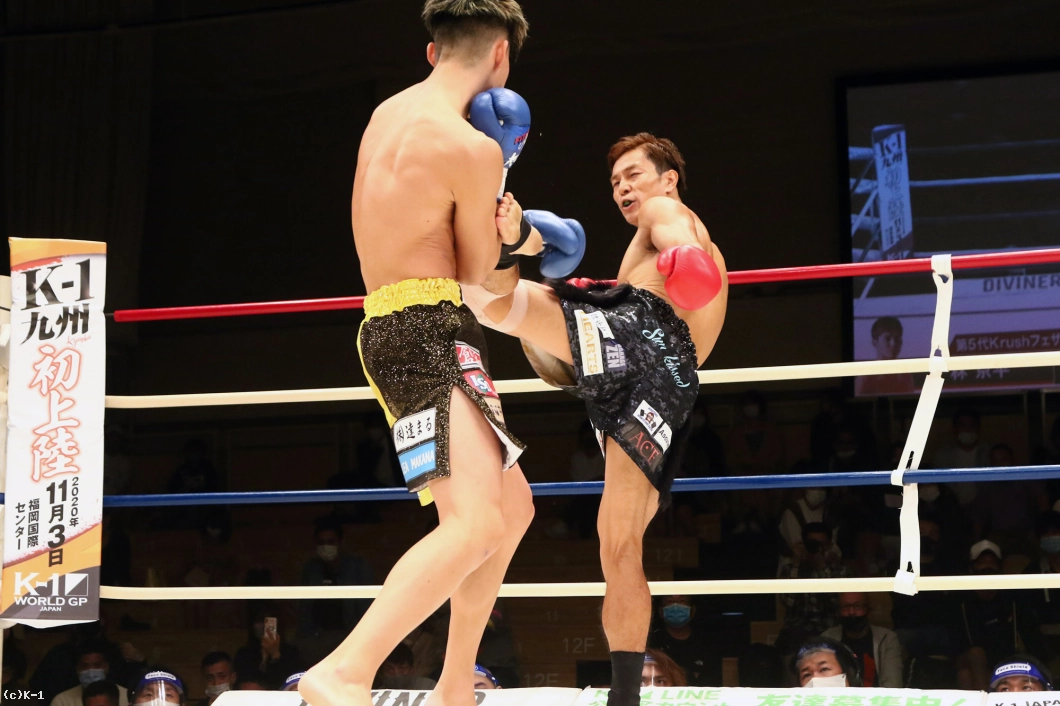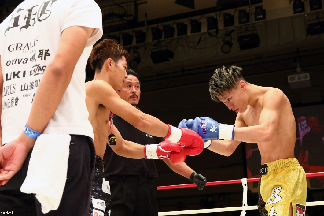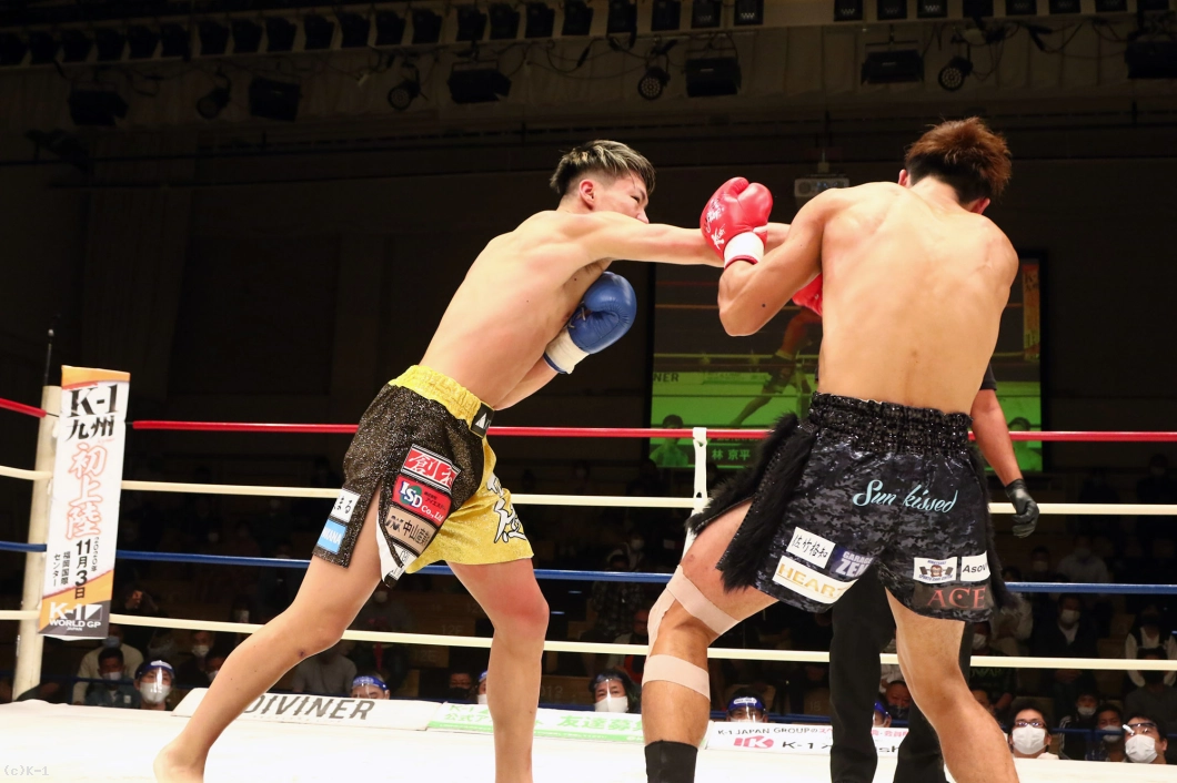 2Rも林はローとミドルで距離を取らんとするが、岡嶋は飛びヒザとそこから左フックを当てる。林は再び蹴りの組み立てに戻ってローを当てる。岡嶋は再度飛びヒザを見せ、そこから右ストレートを伸ばすが、林も左フックと右クロスで迎え撃つ。岡嶋は林の蹴りを受けても圧力をかけて右ストレートを伸ばす。そしてラウンド終盤、その右ストレートを当てて林からダウンを奪う。