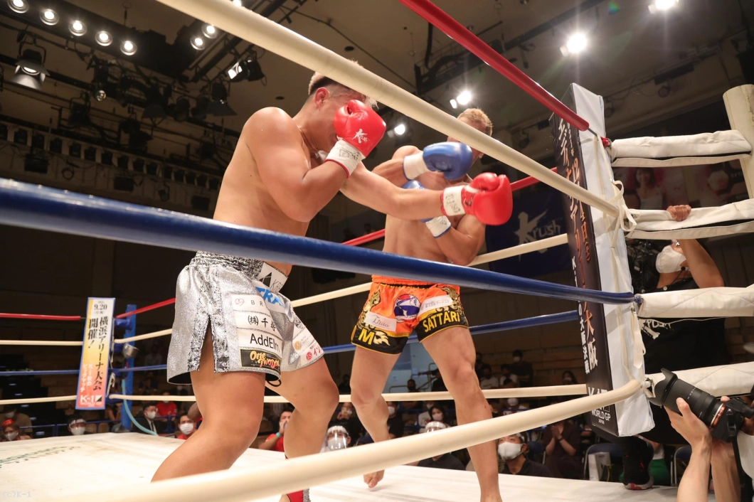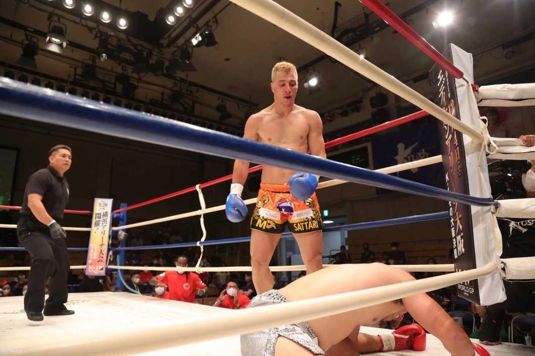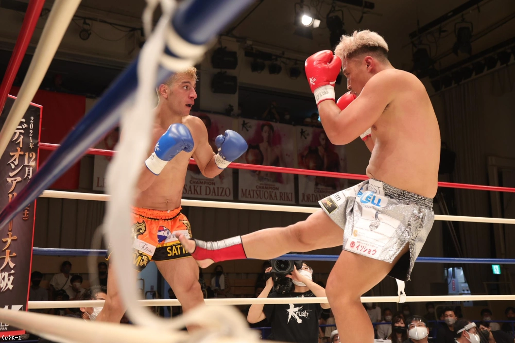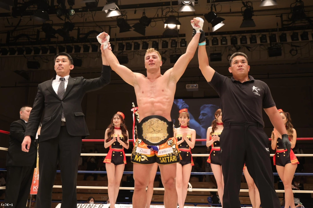 1R、サッタリはジャブで先制して右ボディストレート。谷川がこれに応じて前に出るが、左フックでとらえて先制ダウンを奪う。サッタリはフルスイングのフックの後で後ろ回し蹴り。谷川もガードを固めてジャブとローで反撃。谷川は来いと気合いを見せてローを蹴っていく。そしてサッタリに右ストレート、右ロー、ヒザとサッタリを攻める。しかしここでサッタリが右フックを側頭部に打ち込み谷川が前のめりに倒れ、サッタリが2連続KO勝利でベルトを巻いた。