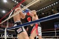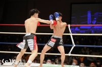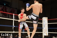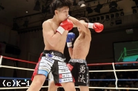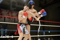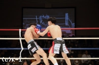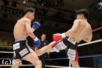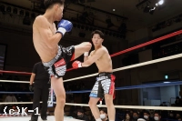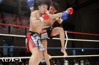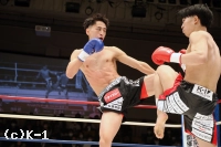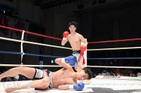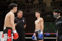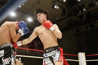 1R、サウスポーの松山は右ジャブのモーションから左ミドルを放って前に出る。やや押され気味に映った寺田だが、松山のガードの横から左フックを打ち込みダウンを奪う。立ち上がった松山のガードの間から右ストレートを入れてフラつかせた寺田だが、松山はガード固めた構えから顔へのヒザを突きあげて上げてダウンを奪い返す。しかし立ち上がった寺田は闘志を落とさず松山に向かい、再び左フックを決めて松山を倒し、KOでホープ対決を制した。