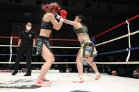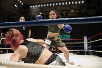 2R、打ち合いの中で右ストレートを当てる真美。しかし美伶もすぐ打ち返して左フックを当てる。美伶はサウスポーに変わり、ミドルから繋いだ左フックで真美をとらえる。だが真美も前に出て圧力を発し右ストレートを当てる。