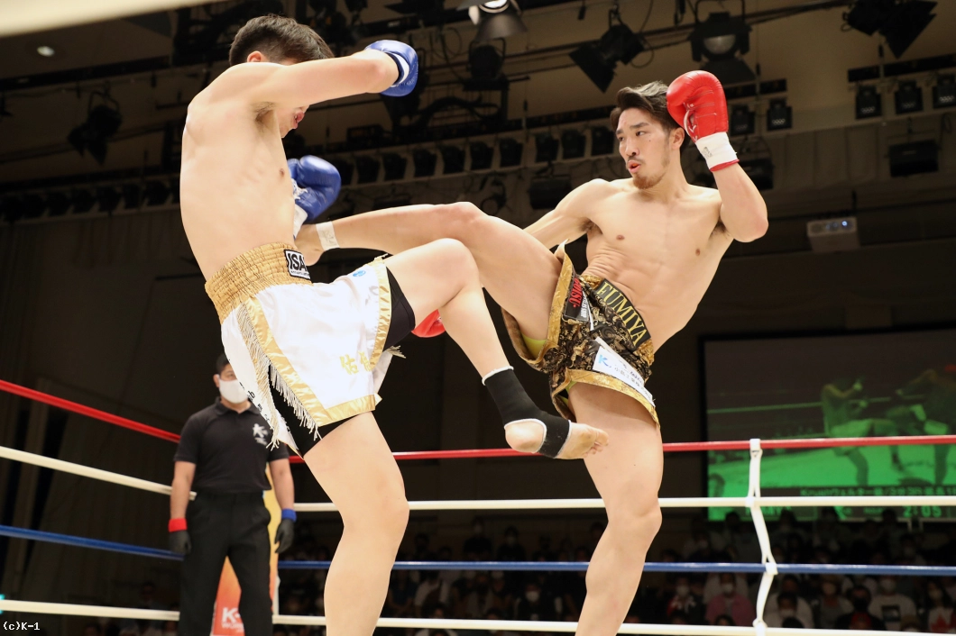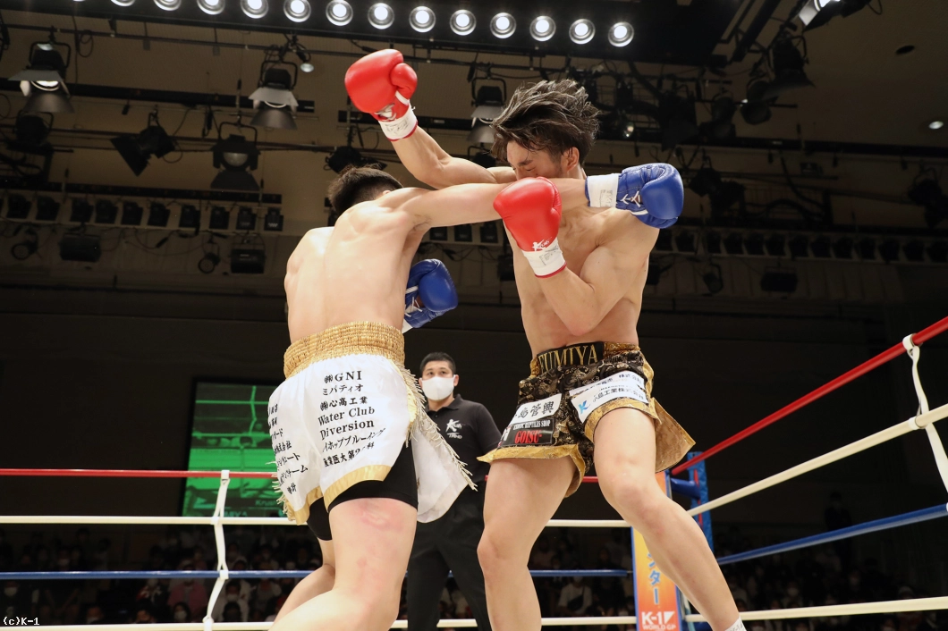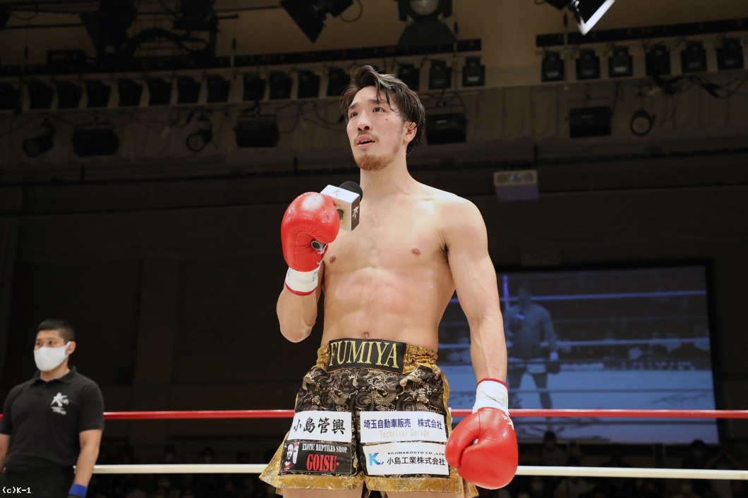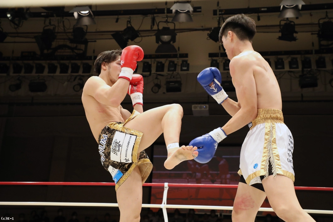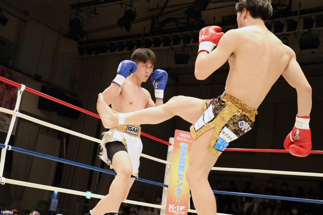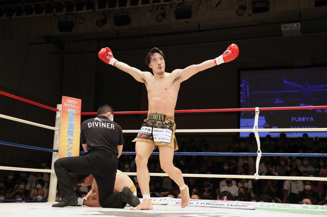 2RはFUMIYAが右ミドルで先制。だが佑悟も右ミドル、左ストレートを返して応戦する。FUMIYAは再び跳びヒザを見せるもクリーンヒットできず、佑悟は逆にハイキックを放ってヒット。左右ミドル、パンチと振るって追う佑悟だが、FUMIYAは攻撃をよく見てかわしていく。3R、両者ミドルを放ってパンチの距離を探る。そこからFUMIYAは跳びヒザを繰り出すと佑悟は直撃を受けダウン。膝をつき、鼻血が見られる佑悟は視線がうつろで、FUMIYAのKO勝利となった。