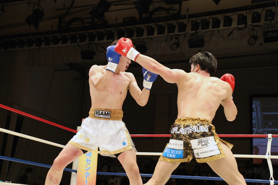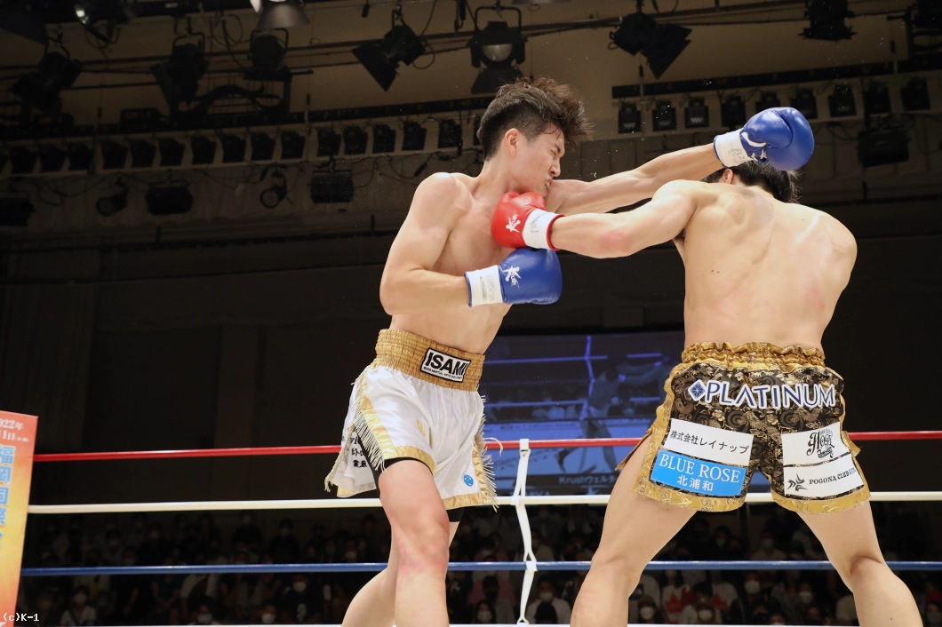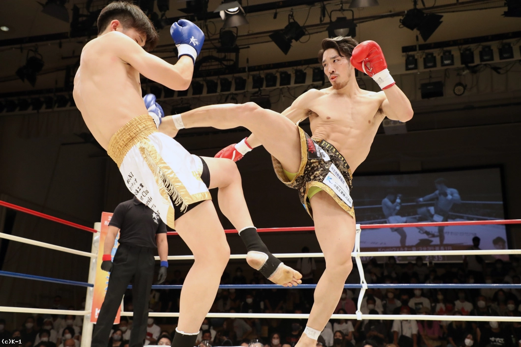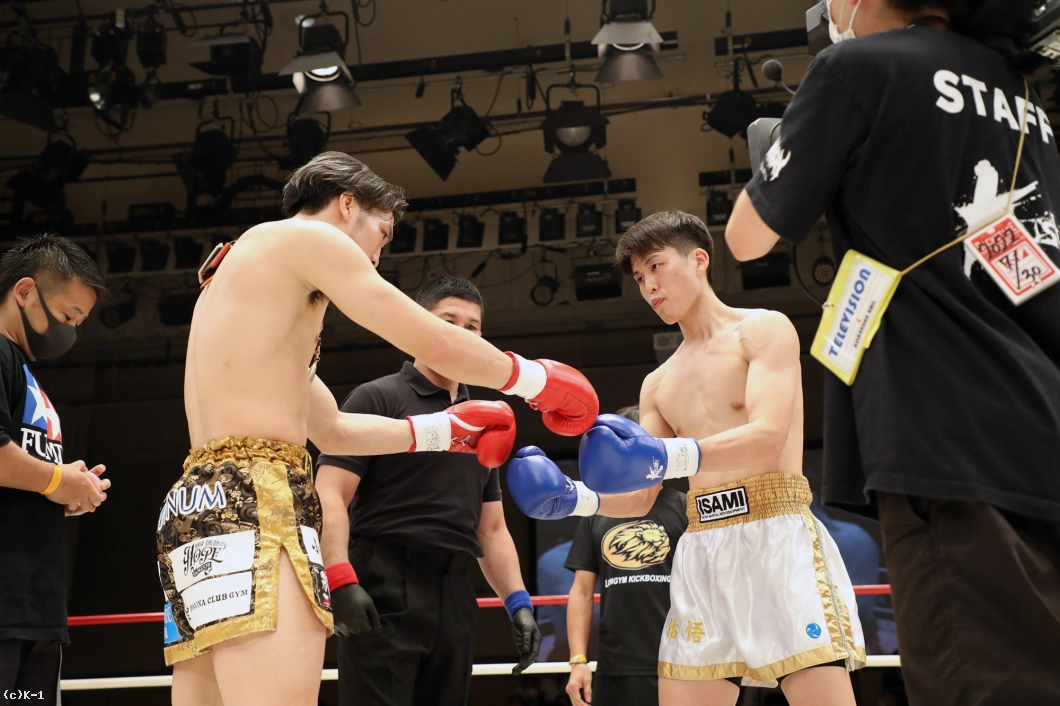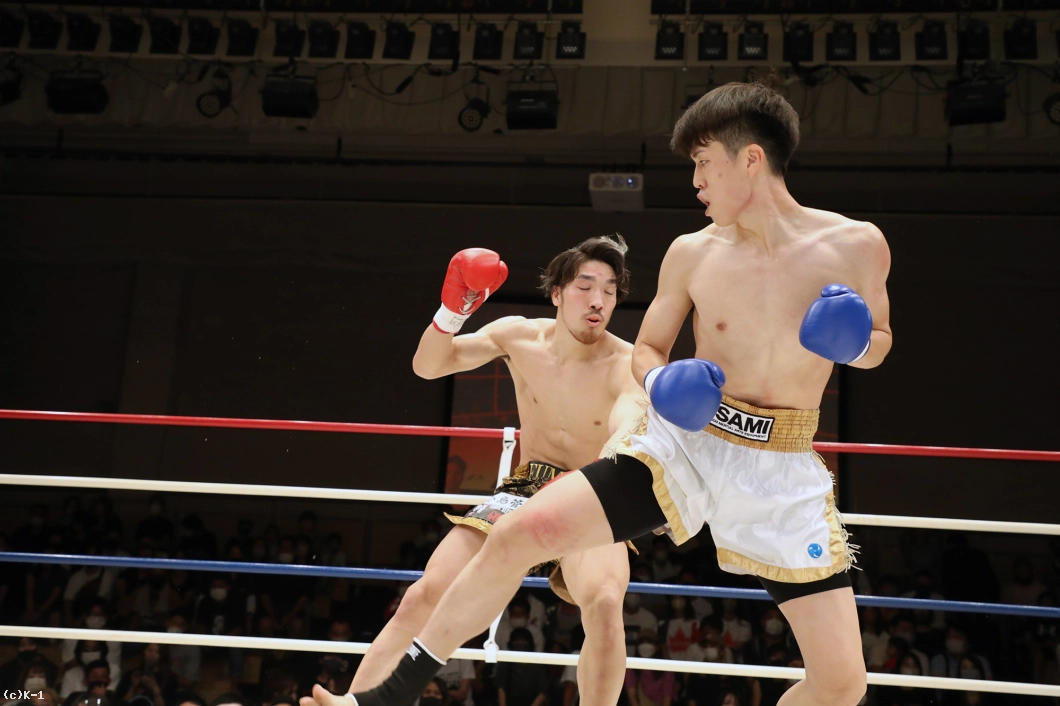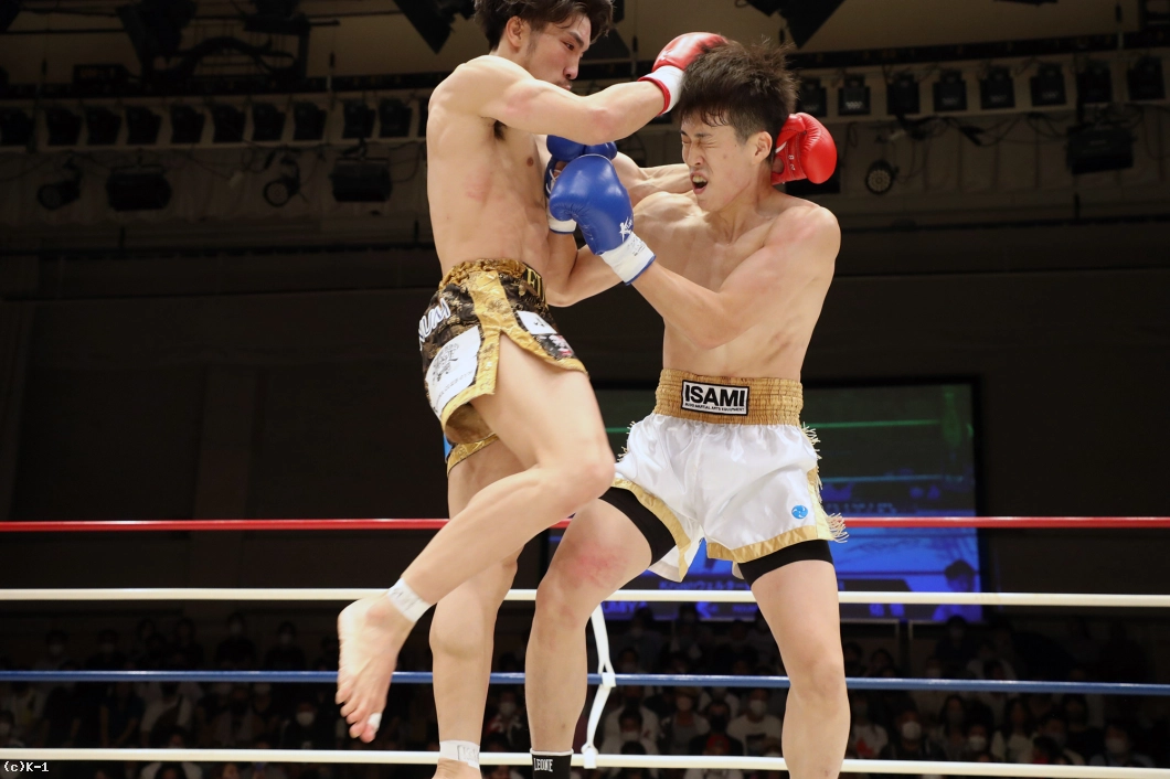 2RはFUMIYAが右ミドルで先制。だが佑悟も右ミドル、左ストレートを返して応戦する。FUMIYAは再び跳びヒザを見せるもクリーンヒットできず、佑悟は逆にハイキックを放ってヒット。左右ミドル、パンチと振るって追う佑悟だが、FUMIYAは攻撃をよく見てかわしていく。3R、両者ミドルを放ってパンチの距離を探る。そこからFUMIYAは跳びヒザを繰り出すと佑悟は直撃を受けダウン。膝をつき、鼻血が見られる佑悟は視線がうつろで、FUMIYAのKO勝利となった。