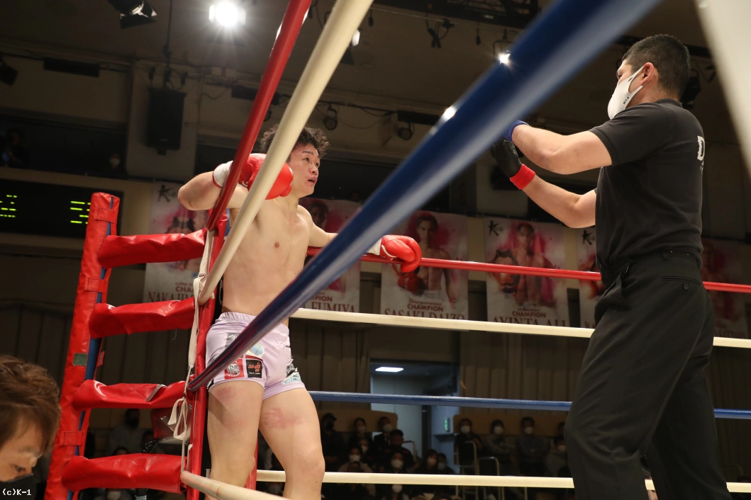 再開すると左ストレート、右フックで反撃する南雲だが赤田の勢いは止まらず、前蹴りと飛びヒザを交えた右フックと左ストレートでさらに南雲を攻める。