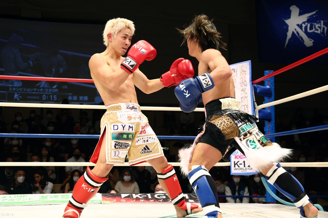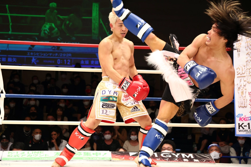 2R、永坂は重心を落とし左右フックを連打。さらにテコンドー式の旋回しての蹴りも連続で見せる。大岩は鉄槌を振るって反撃し、最後は永坂とパンチの打ち合いを繰り広げてエキシビションを終える。