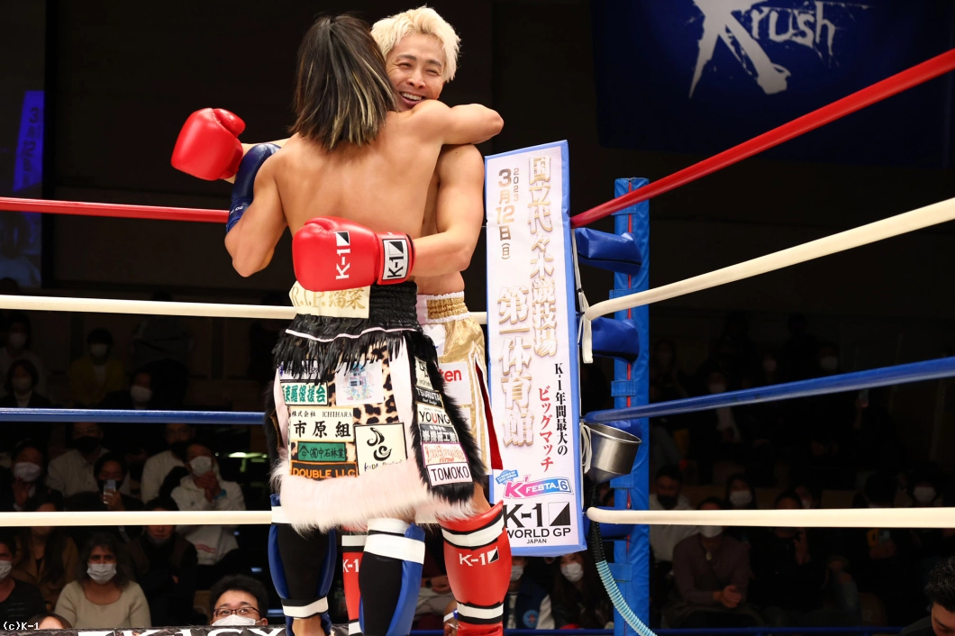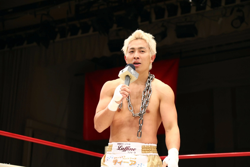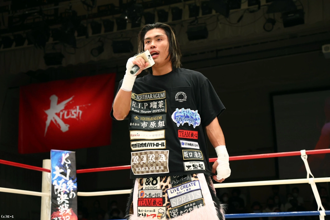 「このタイトルマッチを楽しみにしていてくださったみなさま、こういう結果になって本当に申し訳なかったです。率直に言って相手はプロ失格だと思ってますし、俺からしたら覚悟足りないなと思ってるので、早く治してもらって、チャンピオンを食って、K-1 NEXTはおれが引っ張っていこうと思ってるので、よろしくお願いいたします。