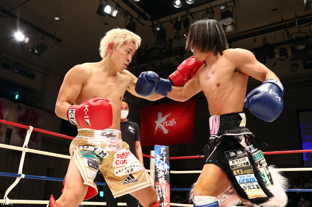 1R、両者オーソドックスからジャブとローで応戦。永坂はそこからミドル、ハイと矢継ぎ早に飛ばしていく。大岩はジャブから重厚なローを連係。だが永坂はミドルから後ろ回し蹴りを放ち、大岩の顔面をとらえる。
