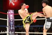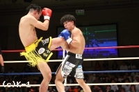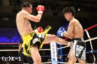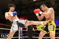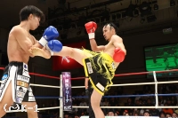 1R、サウスポーの新美は寺田の前蹴り、カーフを意に介さず前に出る。寺田は右前蹴り・ヒザ蹴りを新美のボディに突き刺す。新美も左ミドルを寺田にヒットし、寺田は右ミドル・左カーフキックを蹴る。被弾があっても前進を止めない新美。寺田は左ボディフック、右ハイキックとヒットを重ね、新美も左ショートストレートで反撃する。