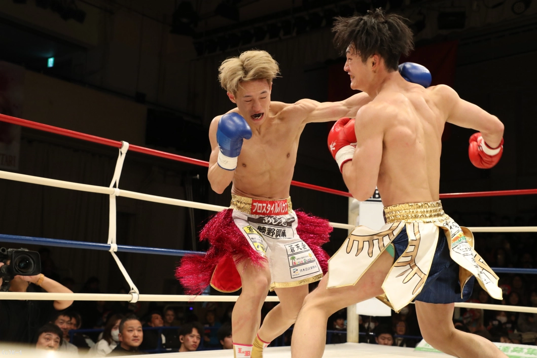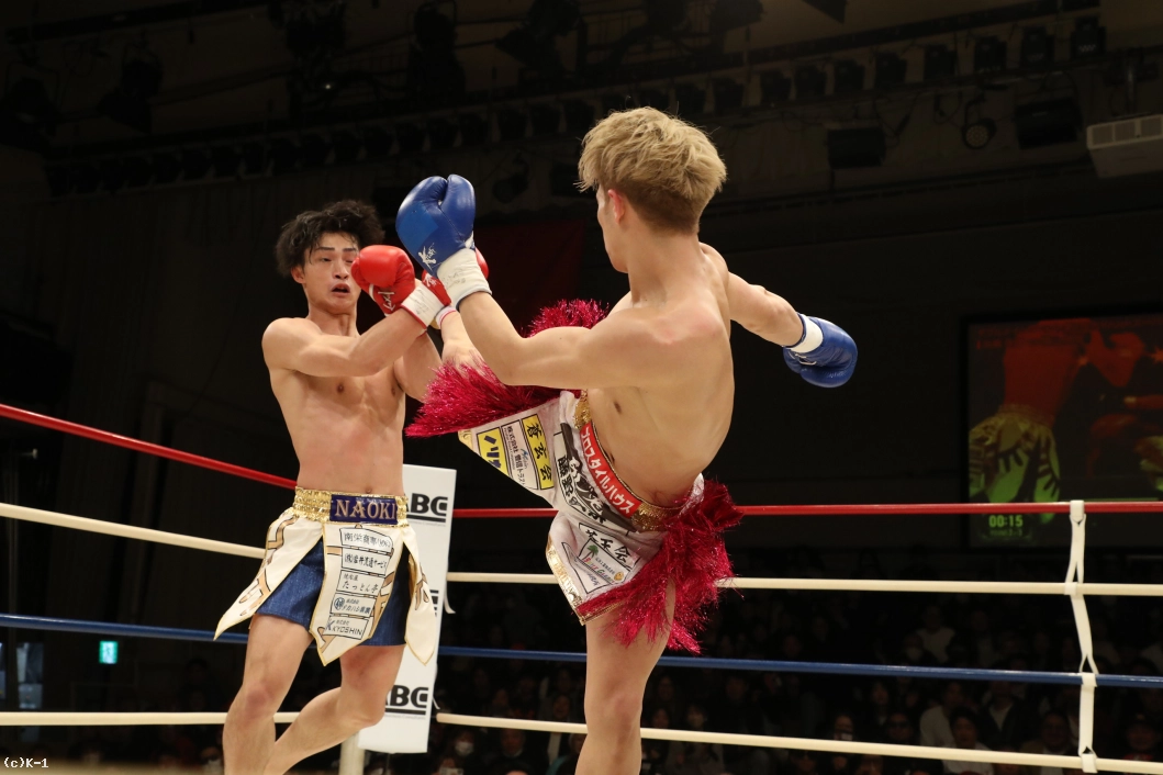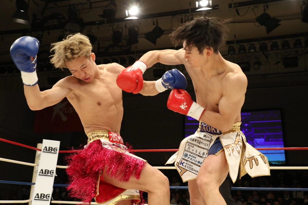 2R、髙橋は横山の左ストレートに再びカウンターで右のオーバーハンドを返す。髙橋は不用意に攻撃を出さず、横山の左に合わせるカウンターを狙っているようだ。横山の左のインローに髙橋は右ストレートをカウンターで当てる。横山も左ストレートを返し、お互いにパンチを一発ずつ当て、だんだんとパンチの距離になってきた。