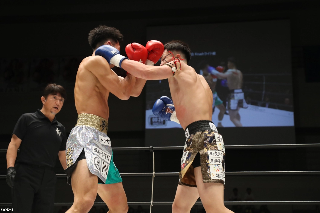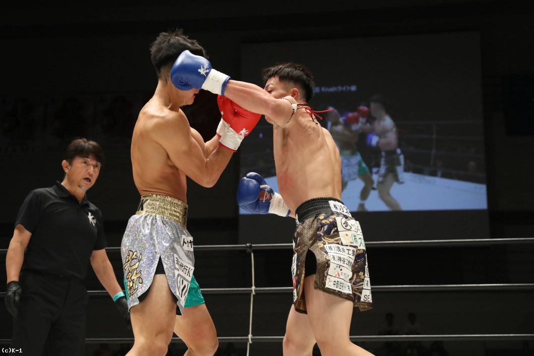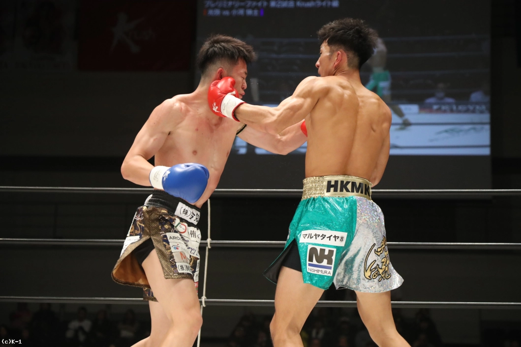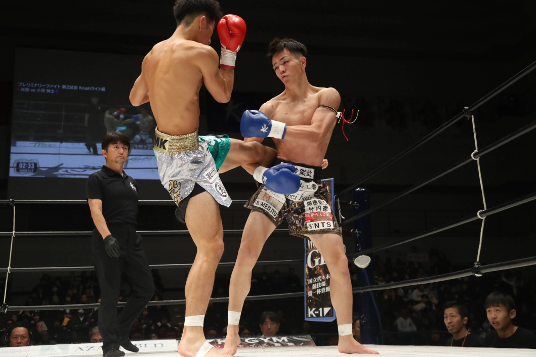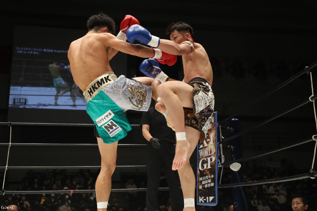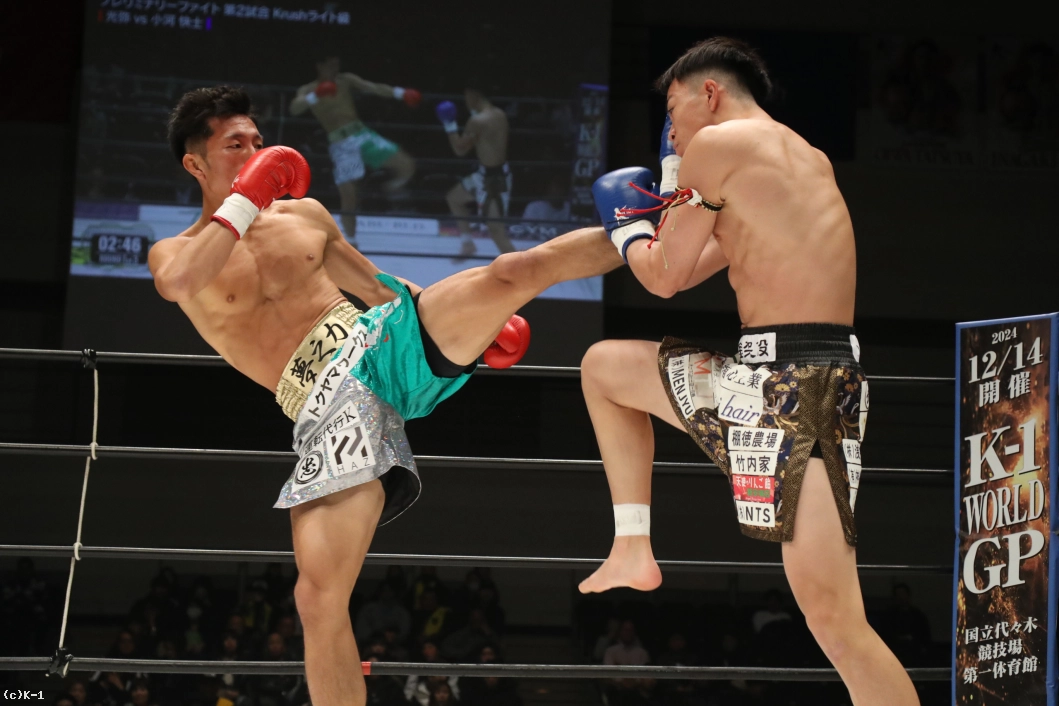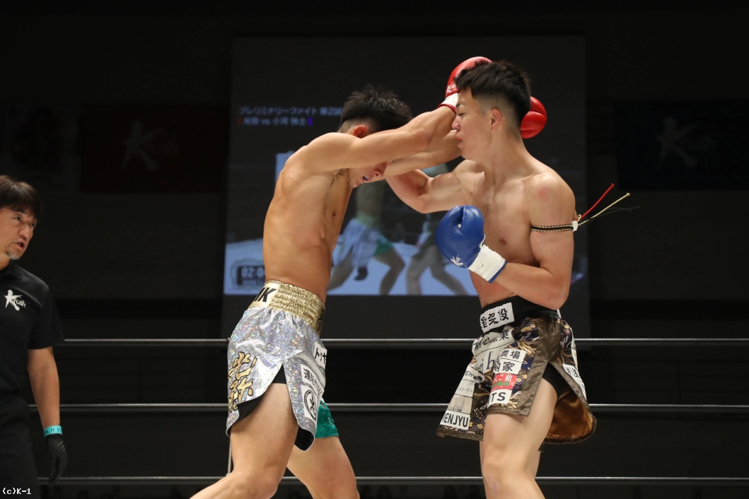 1R、光弥が前帰りからワンツー。サウスポーの小河はワンツーから左ハイキックを繰り出す。前に出る光弥に小河が内側をえぐるような左ストレートをヒット。距離が詰まると両者ショートのワンツーからテンカオに繋げボディを削り合う。