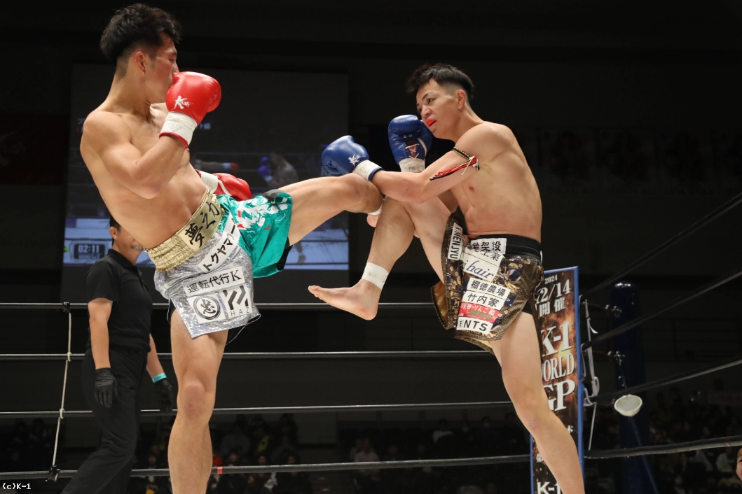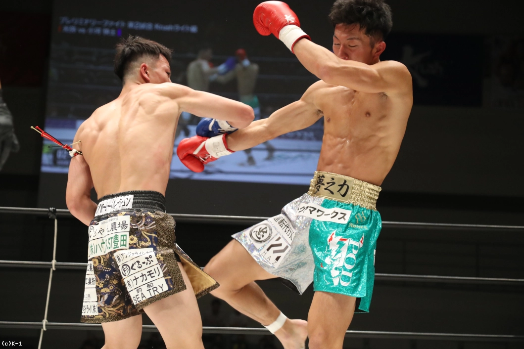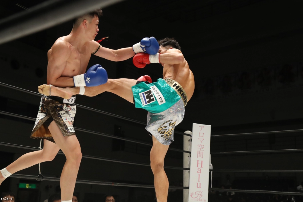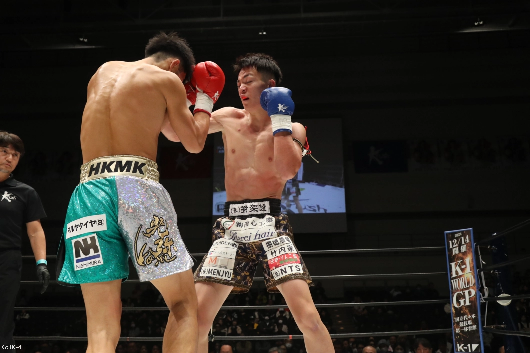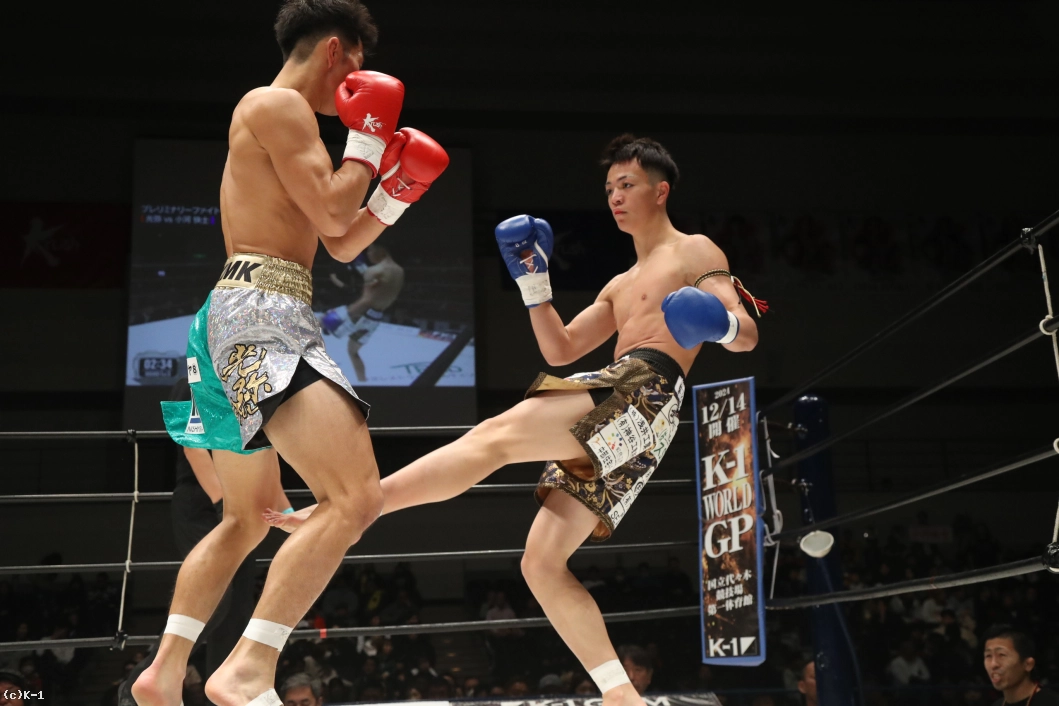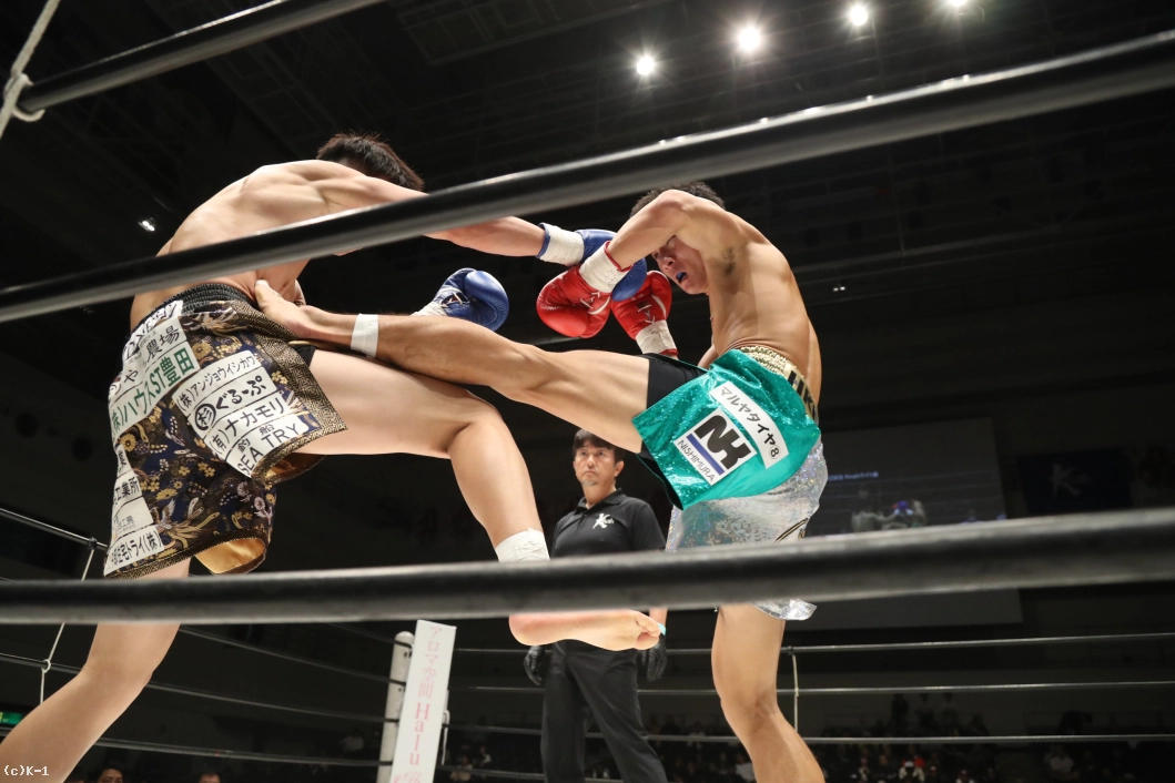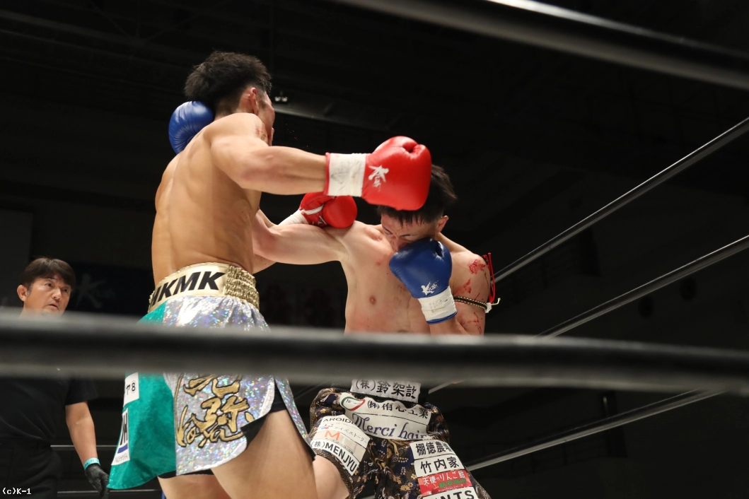 1R、光弥が前帰りからワンツー。サウスポーの小河はワンツーから左ハイキックを繰り出す。前に出る光弥に小河が内側をえぐるような左ストレートをヒット。距離が詰まると両者ショートのワンツーからテンカオに繋げボディを削り合う。