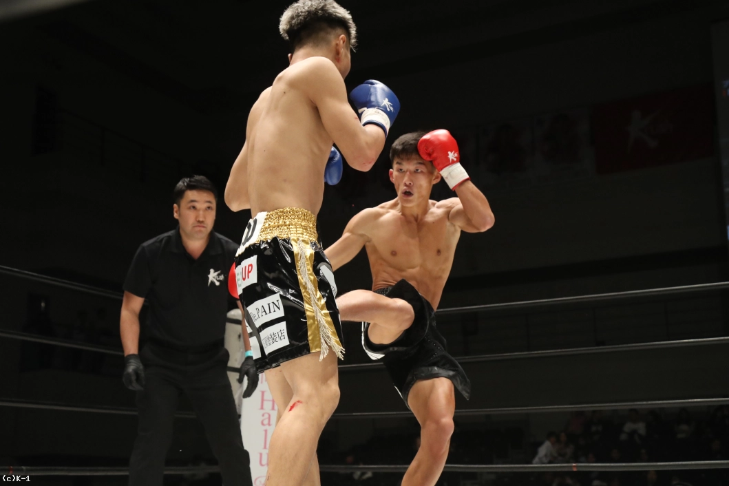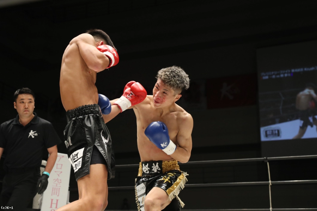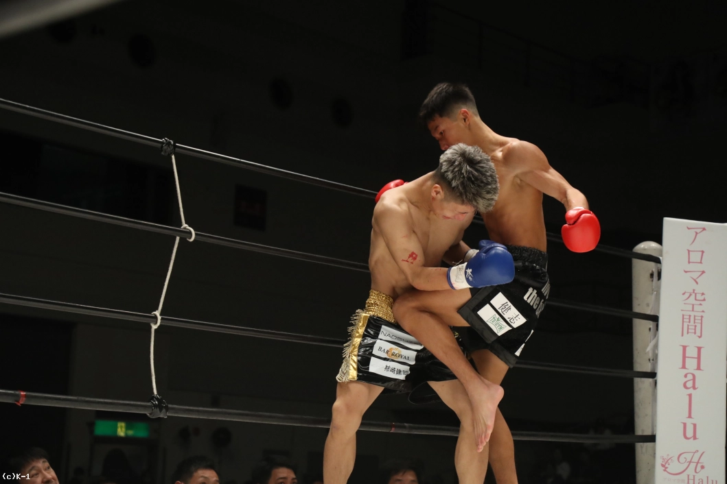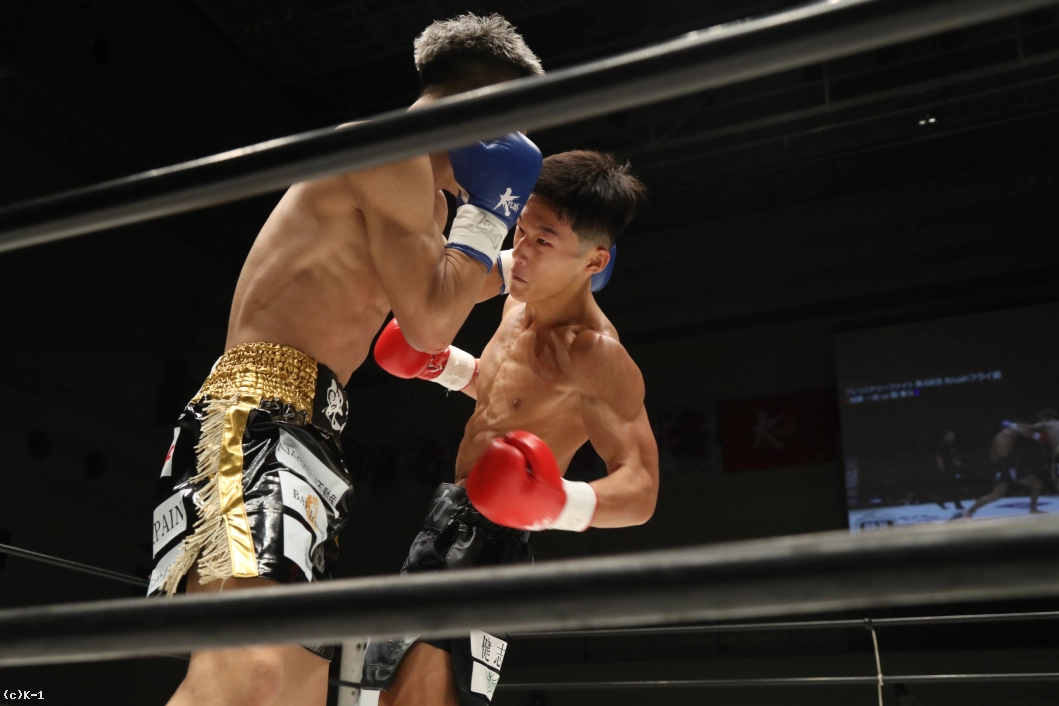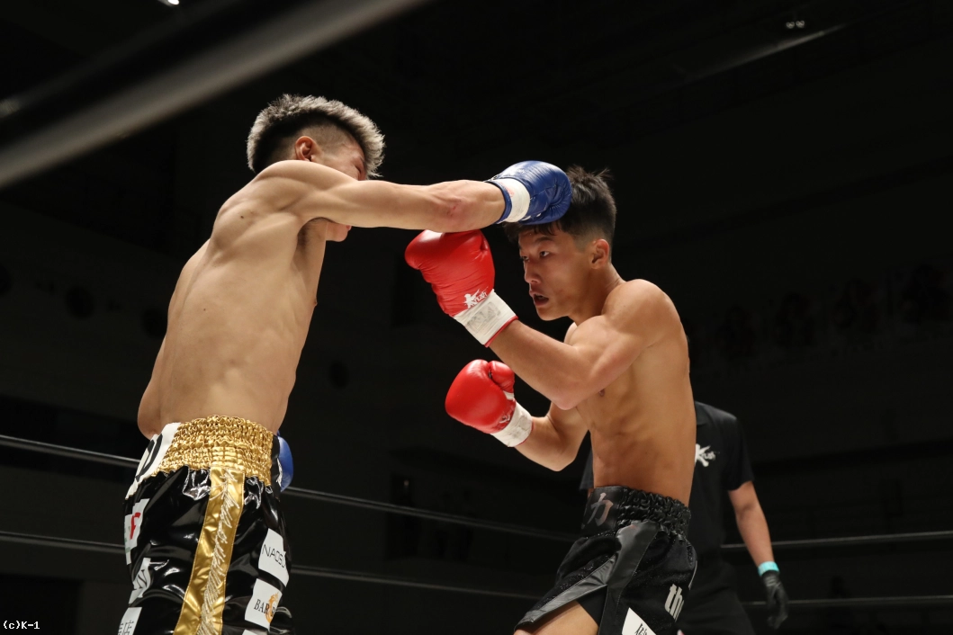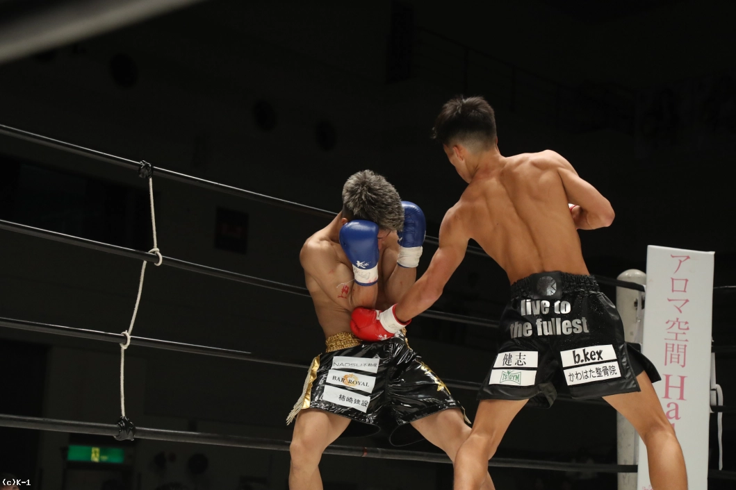 1R、加藤が前蹴りで距離を取ると、開は飛び込んでワンツー。ワンツー、右カーフで上下に散らす開に、加藤も蹴りとボディブローで多彩な攻撃を見せる。終盤には加藤が左フックを顔面に直撃させ開の動きを止める。