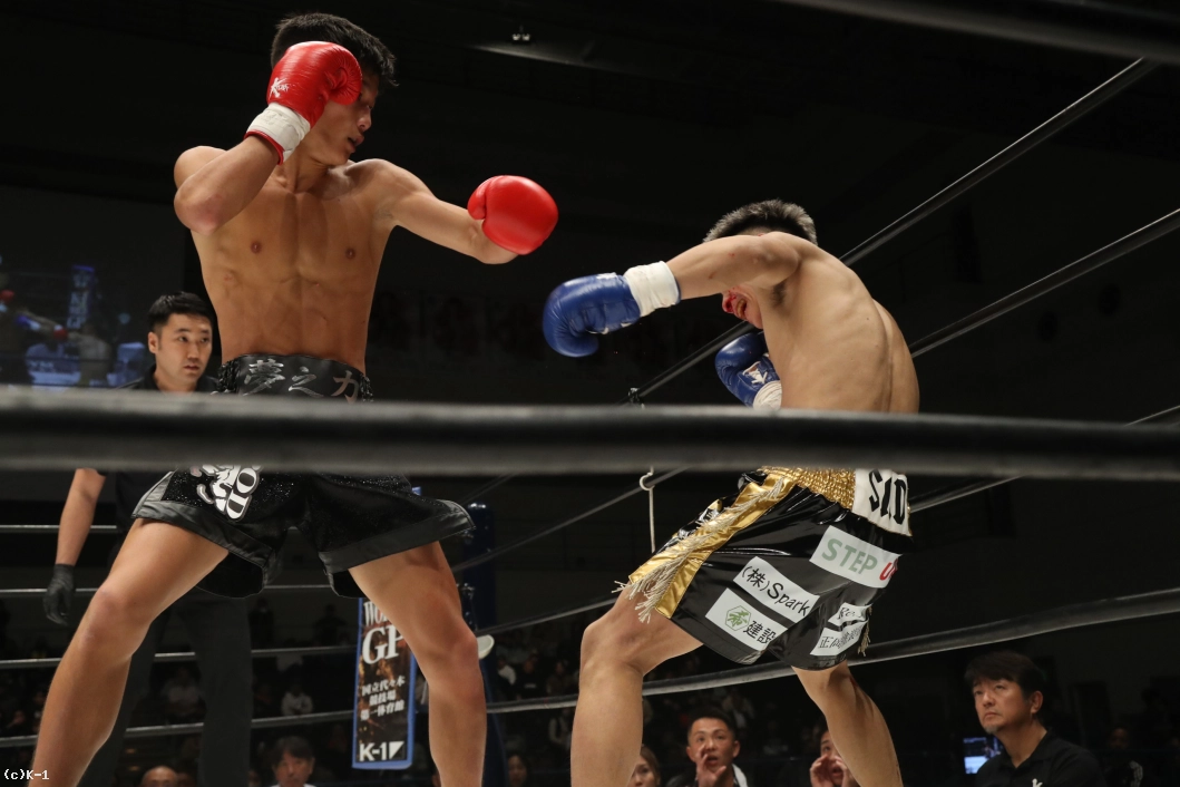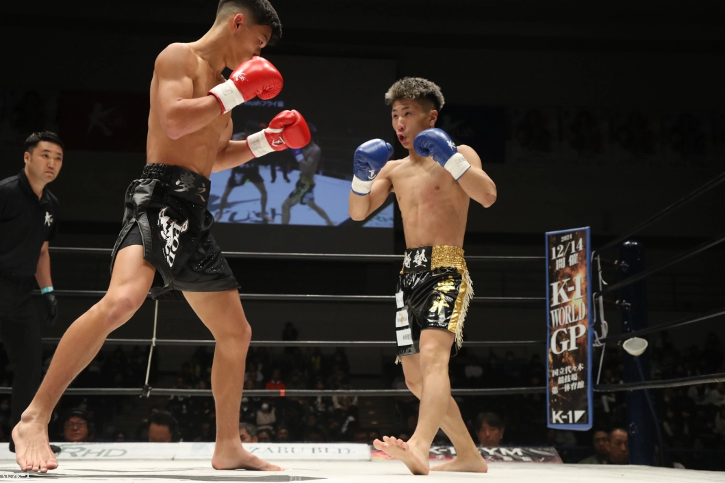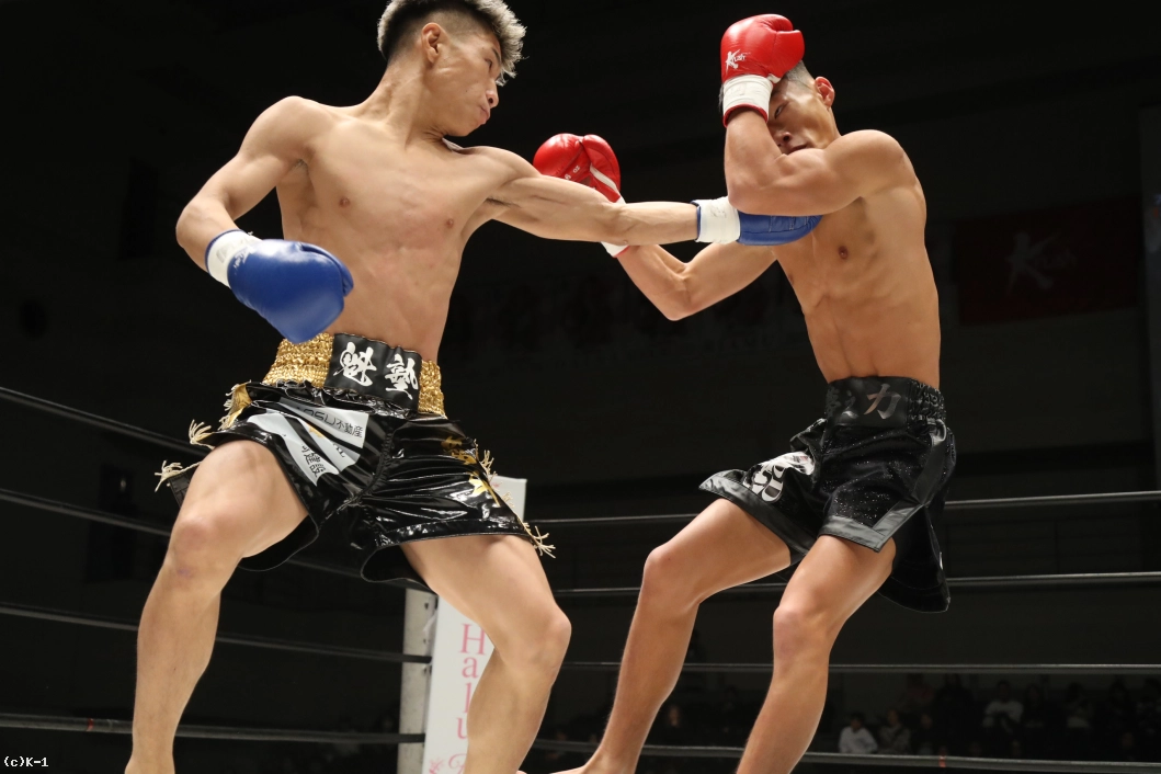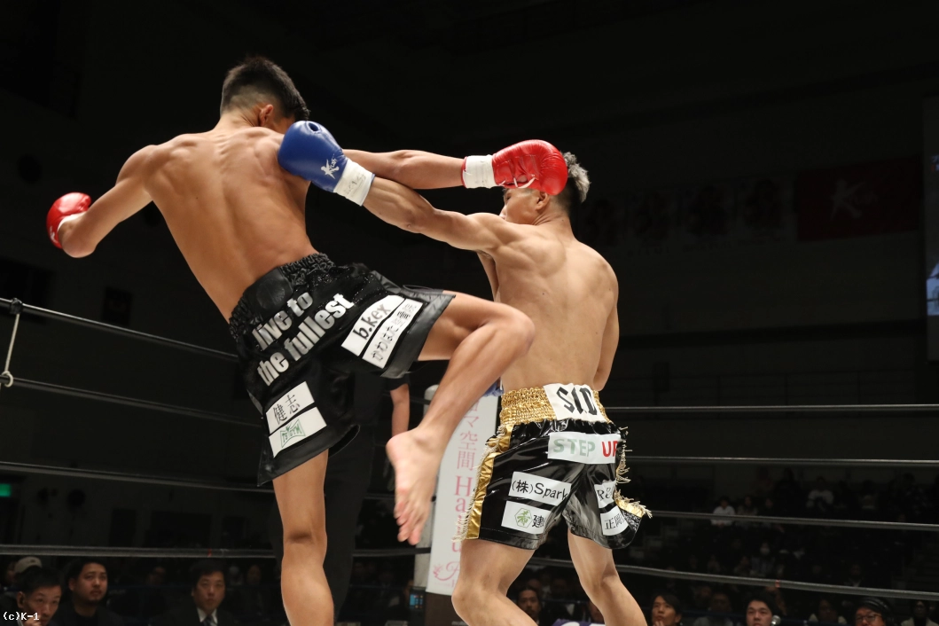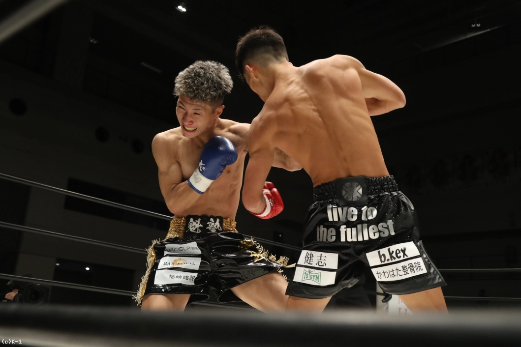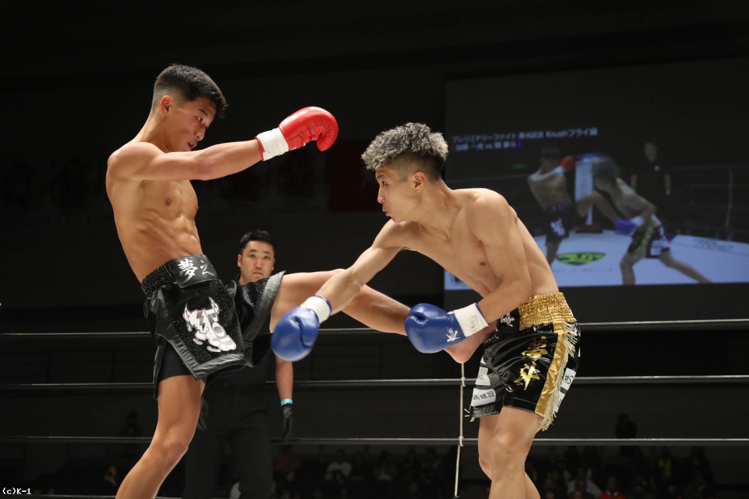 1R、加藤が前蹴りで距離を取ると、開は飛び込んでワンツー。ワンツー、右カーフで上下に散らす開に、加藤も蹴りとボディブローで多彩な攻撃を見せる。終盤には加藤が左フックを顔面に直撃させ開の動きを止める。