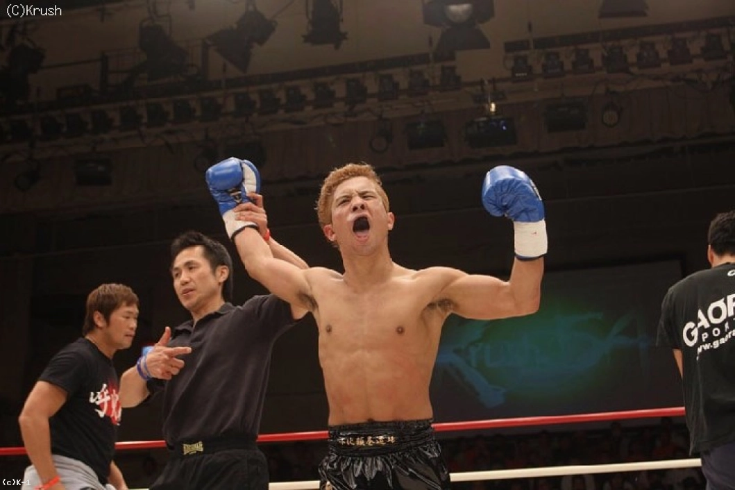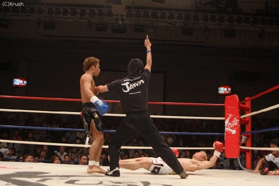 3R、一気にパンチとヒザ蹴りで前に出る小澤。右フックを効かせると、右ストレートを叩き込んで翔也をなぎ倒す。何とか立ち上がる翔也だが、小澤がすぐさまパンチで襲いかかり、右フックを連打。これで翔也はばったりと後方に倒れ、小澤が衝撃のKO勝利を収めた。(小澤=勝ち点5、翔也=勝ち点3)