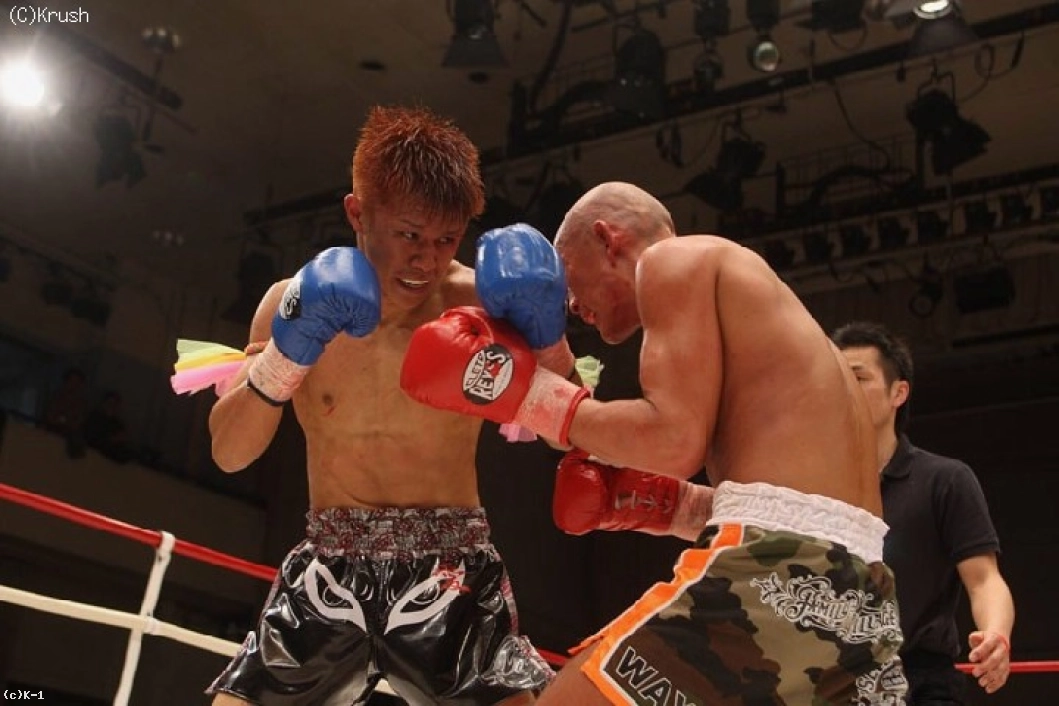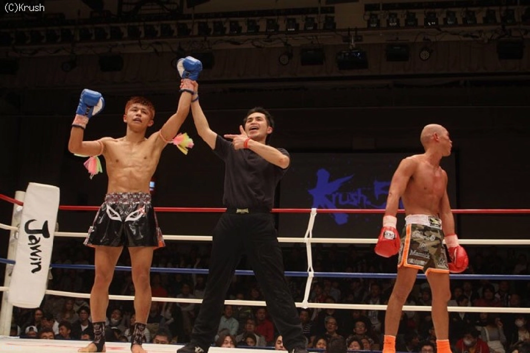 延長R、先に前に出たのは堀尾。右ロー・右ハイで匠を下がらせて、右フックを叩きつけて攻め込む。匠も右ストレートとボディへのヒザ蹴りを返して応戦。このラウンドも最後まで激しい打ち合いが続き、一進一退の攻防となったが、判定は2-1で堀尾の勝利。55kgのトップファイター対決を堀尾が制した。