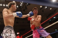 2R、ボディへのパンチから左ハイキックにつなげる瑠輝也。細越はガードを上げてパンチで前に出て、瑠輝也は右のパンチを返しつつ、構えをスイッチしてバックキックも蹴るる。